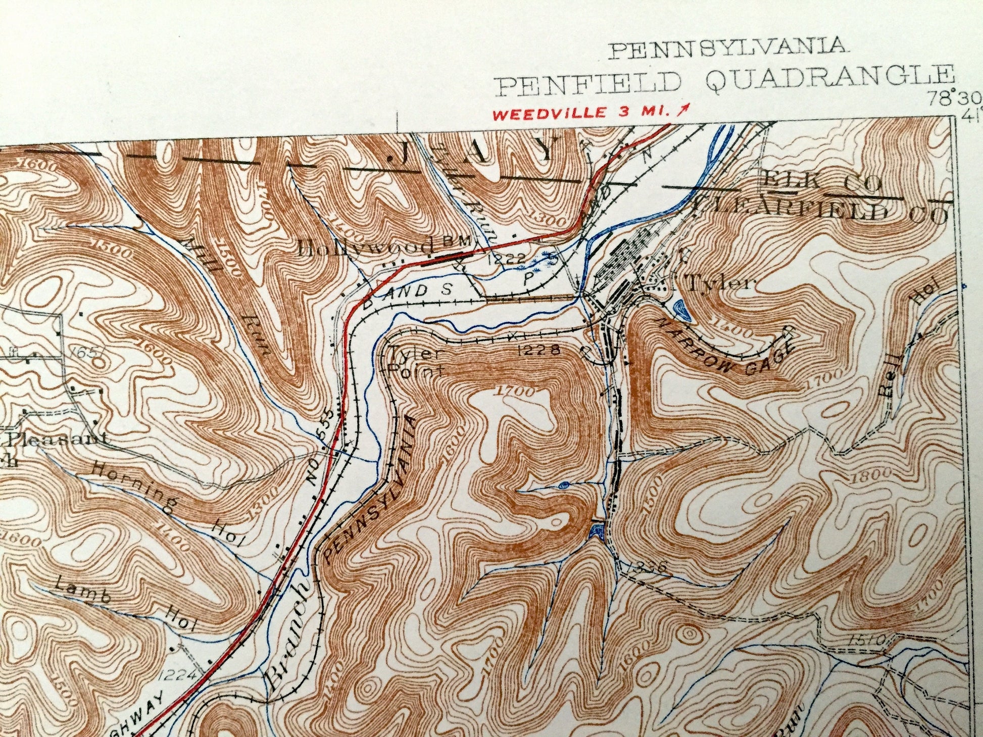 Beautiful, antique map of Penfield, Pennsylvania and surrounding Clearfield, Elk & Jefferson County areas. This is an authentic 1932 print from the U.S. Geological Survey and NOT a computer reproduction.
