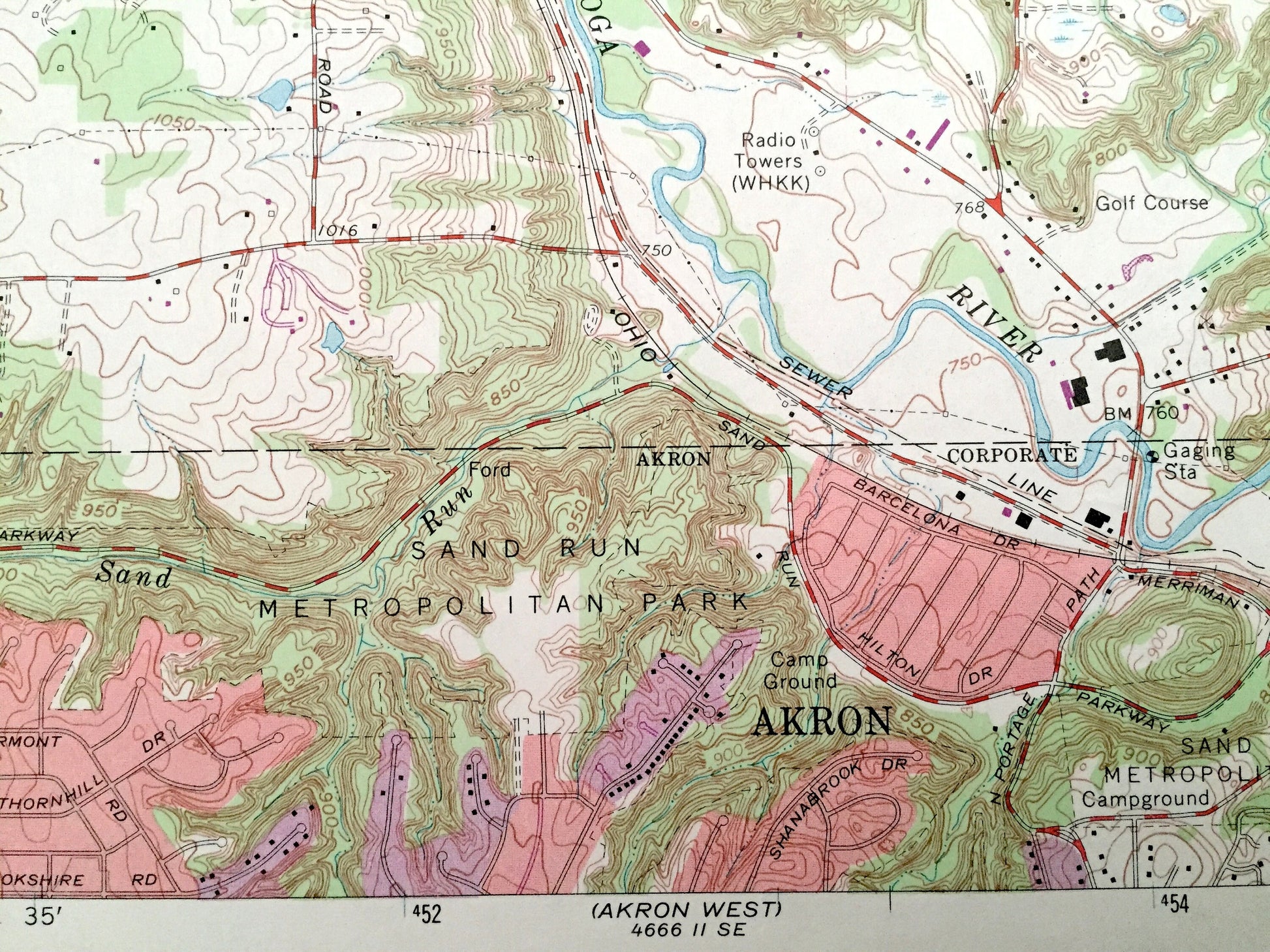 Points of Interest: Cuyahoga River, Akron Sewage Disposal, Police Rifle Range and Dog Training Area, Sand Run Metropolitan Park, Ascot Park, Boston Ledges, Ritchie Ledges, Virginia Kendall Park, Tamsin Park, Wyoga Lake Park, Furnace Run, Yellow Creek, Sand Run, Mud Brook, Salt Run, Boston Run, Slipper Run, campgrounds, and many more hills, ditches, streams, creeks, ponds, houses, schools, railroads, churches and roads.