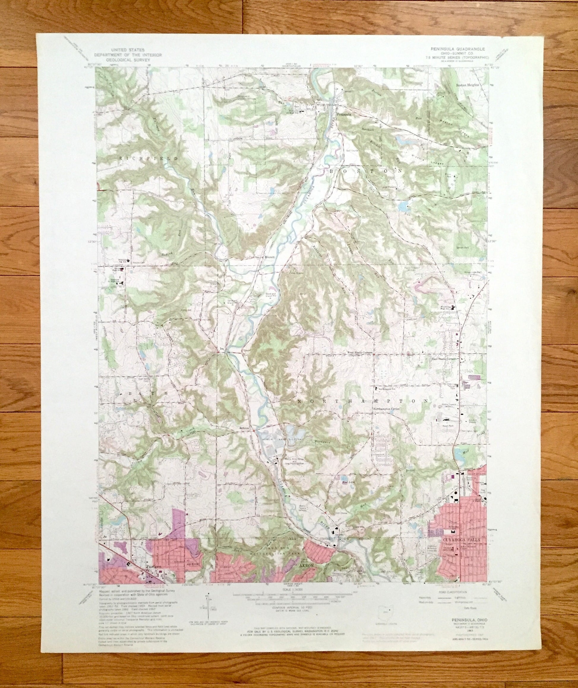 Beautiful, antique map of Peninsula, Ohio and surrounding Summit County areas. This is an authentic 1963 edition, 1967 print from the U.S. Geological Survey and NOT a computer reprint.