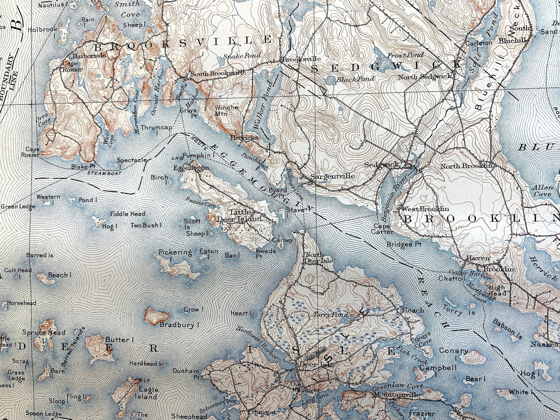 Points of Interest: Knox County, Waldo County, Hancock County, Penobscot Bay, Jericho Bay, Bluehill Bay, Belfast Bay, Eggemoggin Reach, Bluehill Harbor, Penobscot River, Bagaduce River, Castine Harbor, Northern Bay, Walker Pond, North Islesboro, South Islesboro, Smith Cove, Long Island, Blue Hill, Flye Point, Bluehill Neck, Stinson Neck, Marshall Island, Kimball Island, Eagle Island, Butter Island, Ducktrap Harbor, Island Thorofare, Isle Au Haut Bay, Southern Harbor, Little Thorofare, Hurricane Sound, Winter Harbor, Seal Bay, Mill River, Seven Hundred Acre Island, South Isleboro, Job Island, Butter Island, Barred Islands, Spruce Head Island, Eagle Island, Hardhead Island, The Porcupines, Oak Hill, Webster Head, Egg Rock, Bartlett Harbor, Wooster Cove, Crabtree Point, Kent Cove, Perry Cove, Seal Cove, Calderwood Neck, Long Island, Bluff Head, Coombs Hill, Leadbetter Island, Lairey Narrows, White Islands, Old Harbor, Green Island, Sand Cove, Indian Creek, Roberts Harbor, Arey Neck, Sheep Island, Channel Rock, Diamond Island and lots more hills, streams, ponds, islands, houses, islands, harbors, coves, roads, railroads.