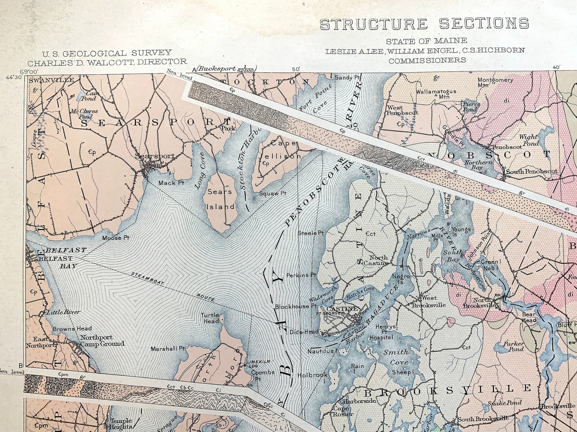 Beautiful, antique Structure Sections map and columnar sections table of Penobscot Bay, Maine and the islands of Knox, Waldo & Hancock Counties. This is an authentic 1907 edition, 1907 print from the U.S. Geological Survey and NOT a computer reproduction. It is from a Geologic Atlas folio. Map also comes with a second sheet describing in great detail the structural sections on the map.