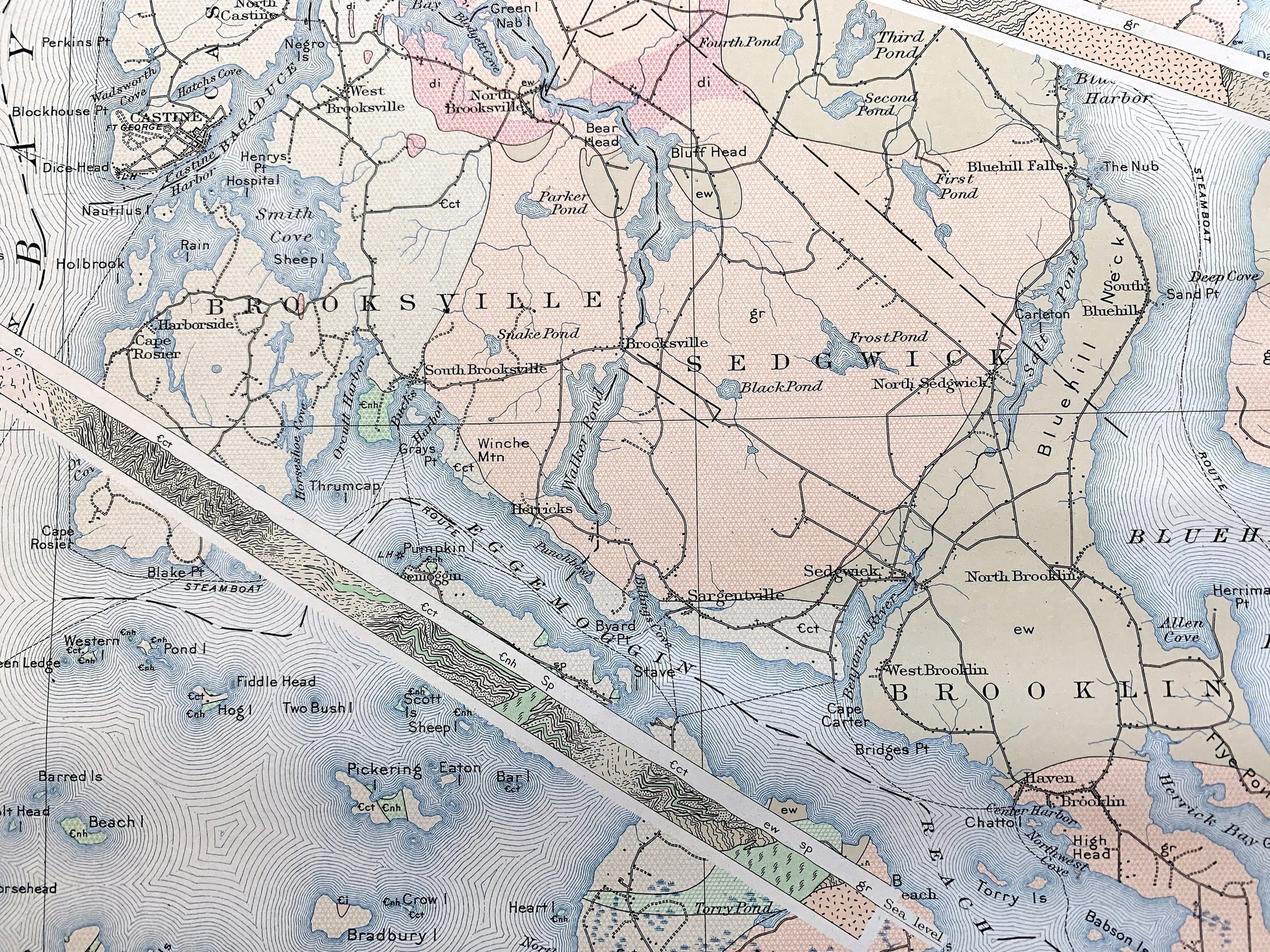 Points of Interest: Knox County, Waldo County, Hancock County, Penobscot Bay, Jericho Bay, Bluehill Bay, Belfast Bay, Eggemoggin Reach, Bluehill Harbor, Penobscot River, Bagaduce River, Castine Harbor, Northern Bay, Walker Pond, North Islesboro, South Islesboro, Smith Cove, Long Island, Blue Hill, Flye Point, Bluehill Neck, Stinson Neck, Marshall Island, Kimball Island, Eagle Island, Butter Island, Ducktrap Harbor, Island Thorofare, Isle Au Haut Bay, Southern Harbor, Little Thorofare, Hurricane Sound, Winter Harbor, Seal Bay, Mill River, Seven Hundred Acre Island, South Isleboro, Job Island, Butter Island, Barred Islands, Spruce Head Island, Eagle Island, Hardhead Island, The Porcupines, Oak Hill, Webster Head, Egg Rock, Bartlett Harbor, Wooster Cove, Crabtree Point, Kent Cove, Perry Cove, Seal Cove, Calderwood Neck, Long Island, Bluff Head, Coombs Hill, Leadbetter Island, Lairey Narrows, White Islands, Old Harbor, Green Island, Sand Cove, Indian Creek, Roberts Harbor, Arey Neck, Sheep Island, Channel Rock, Diamond Island and lots more hills, streams, ponds, islands, houses, islands, harbors, coves, roads, railroads.
