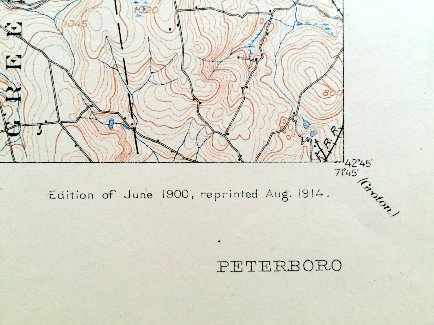 Beautiful, antique map of Peterborough, New Hampshire (spelled the old way here: Peterboro) and surrounding Hillsboro County area on the Contoocook River. This is an authentic 1900 edition, 1914 print from the U.S. Geological Survey and NOT a computer reproduction.