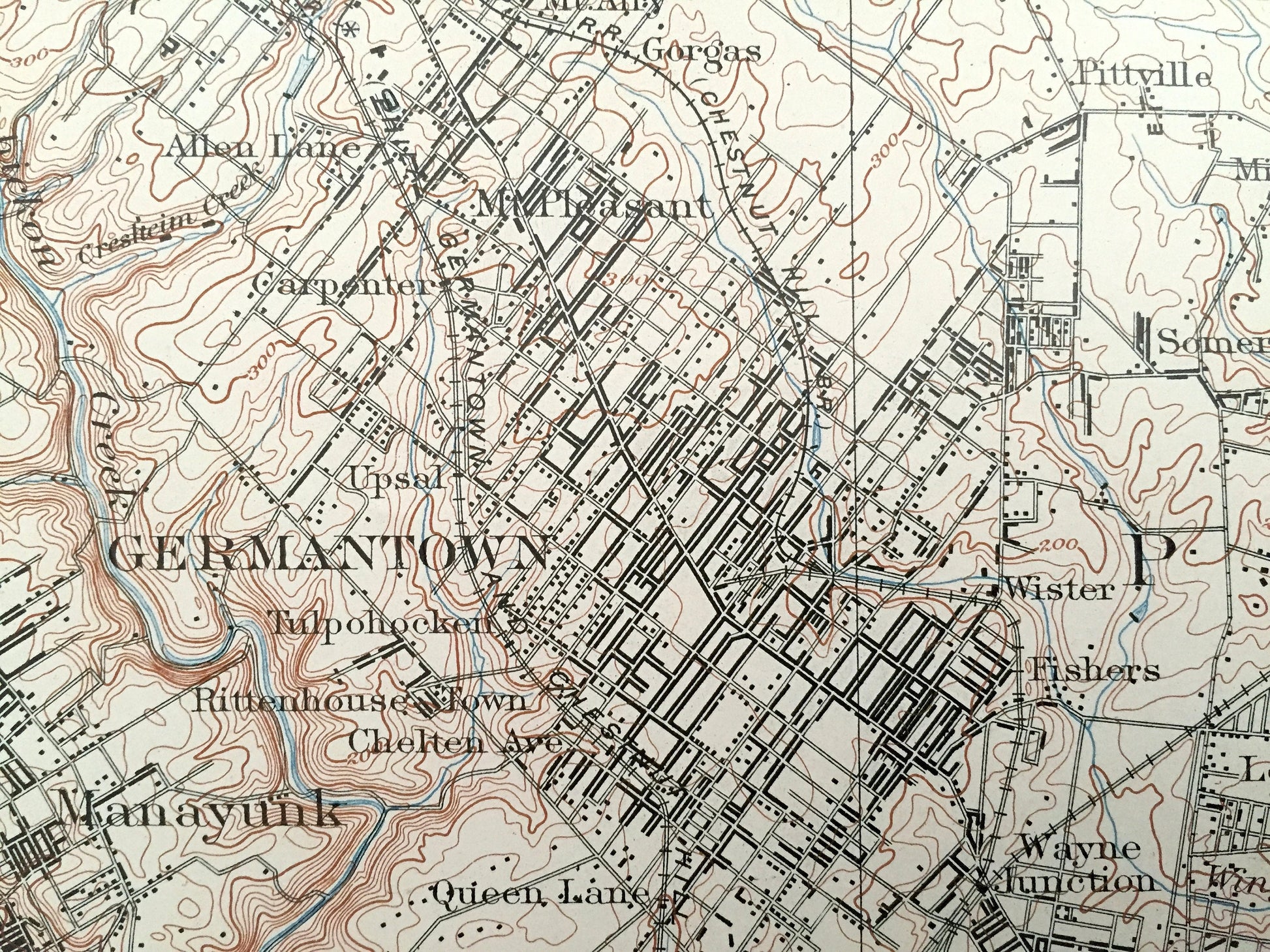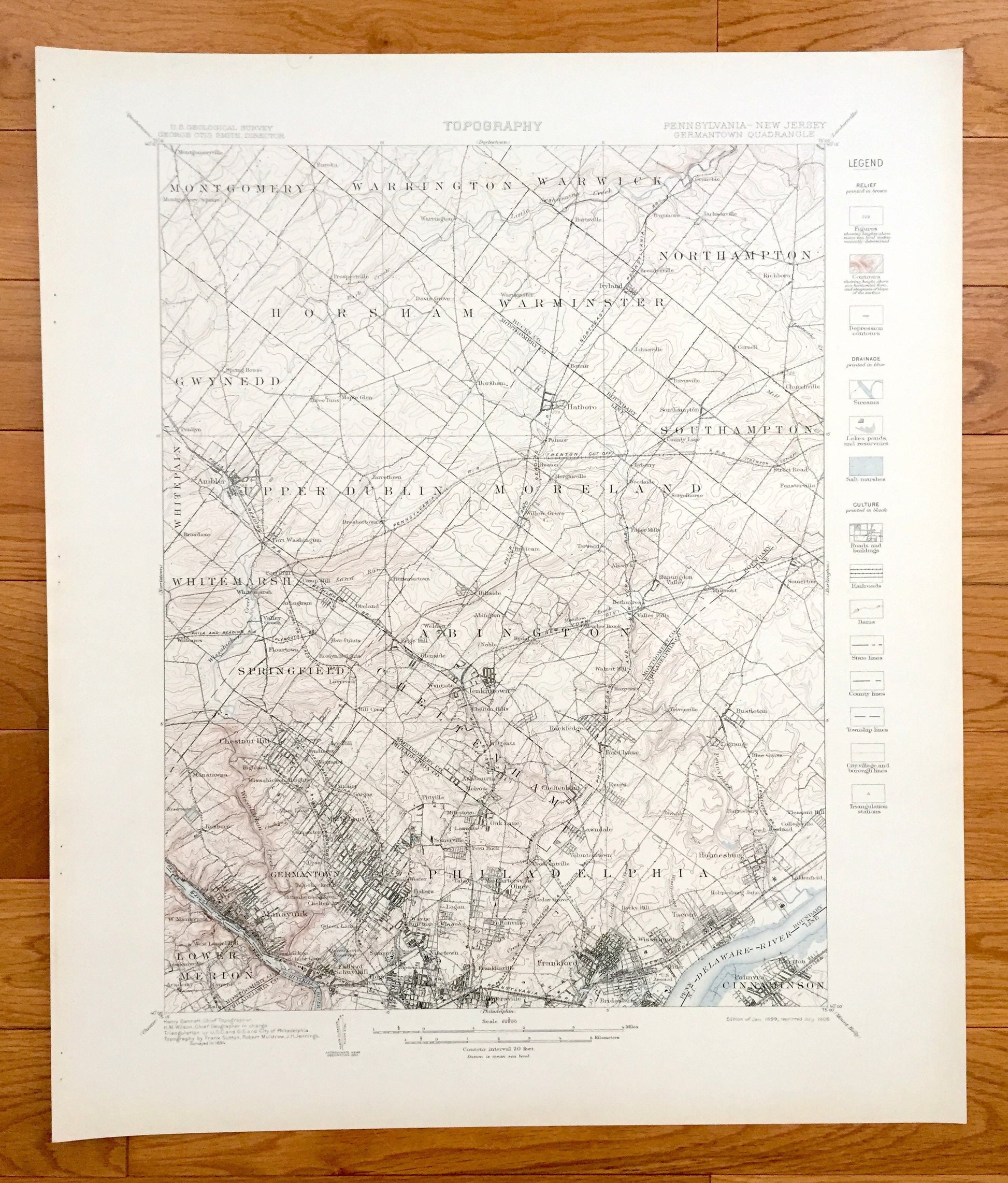 Beautiful, antique map of North Philadelphia, Germantown and surrounding Montgomery & Bucks County area. This is an authentic 1899 edition, 1908 print from a U.S. Geological Survey folio and NOT a computer reproduction.