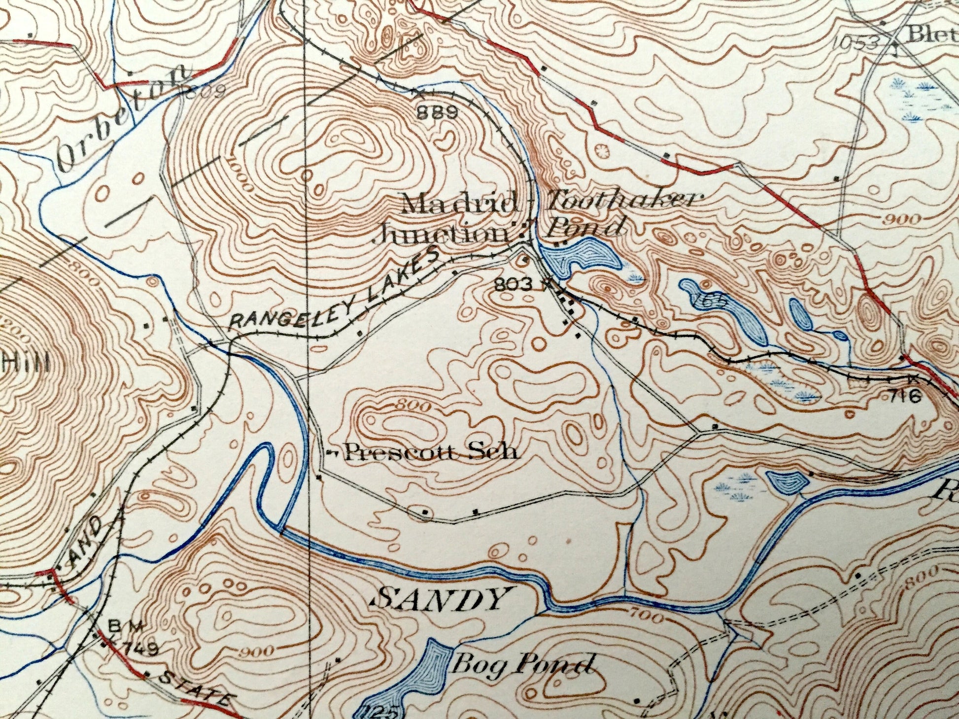 Points of Interest: Poplar Ridge, Sandy River and Rangeley Lakes Railroad, Redington Pond, Mount Abraham, Farmer Mountain, Craig School, Cushman School, Mile Square School, Bear Hill, Winship School, Poe Mountain, Tantrattle Mountain, Mt Blue Pond, Spruce Mountain, Sandy River, Stower school, Bethen School, Bray Hill, Tory Hill, and lots more hills, mountains, streams, ponds, houses, schools and roads.