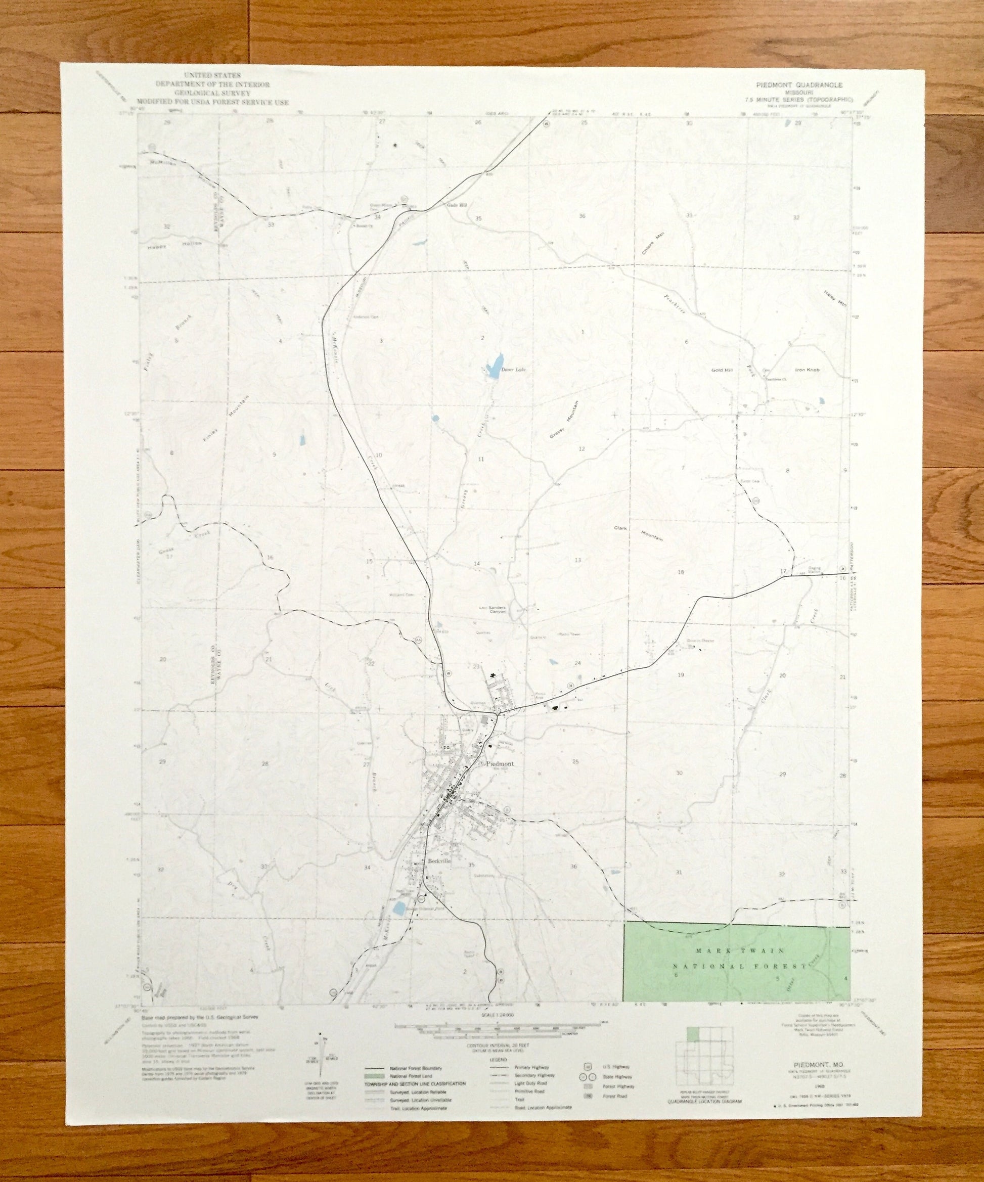 Beautiful, antique map of Piedmont, Missouri and surrounding Reynolds County and Wayne County areas. This is an authentic 1968 edition, 1969 print from the U.S. Geological Survey and NOT a computer reproduction.