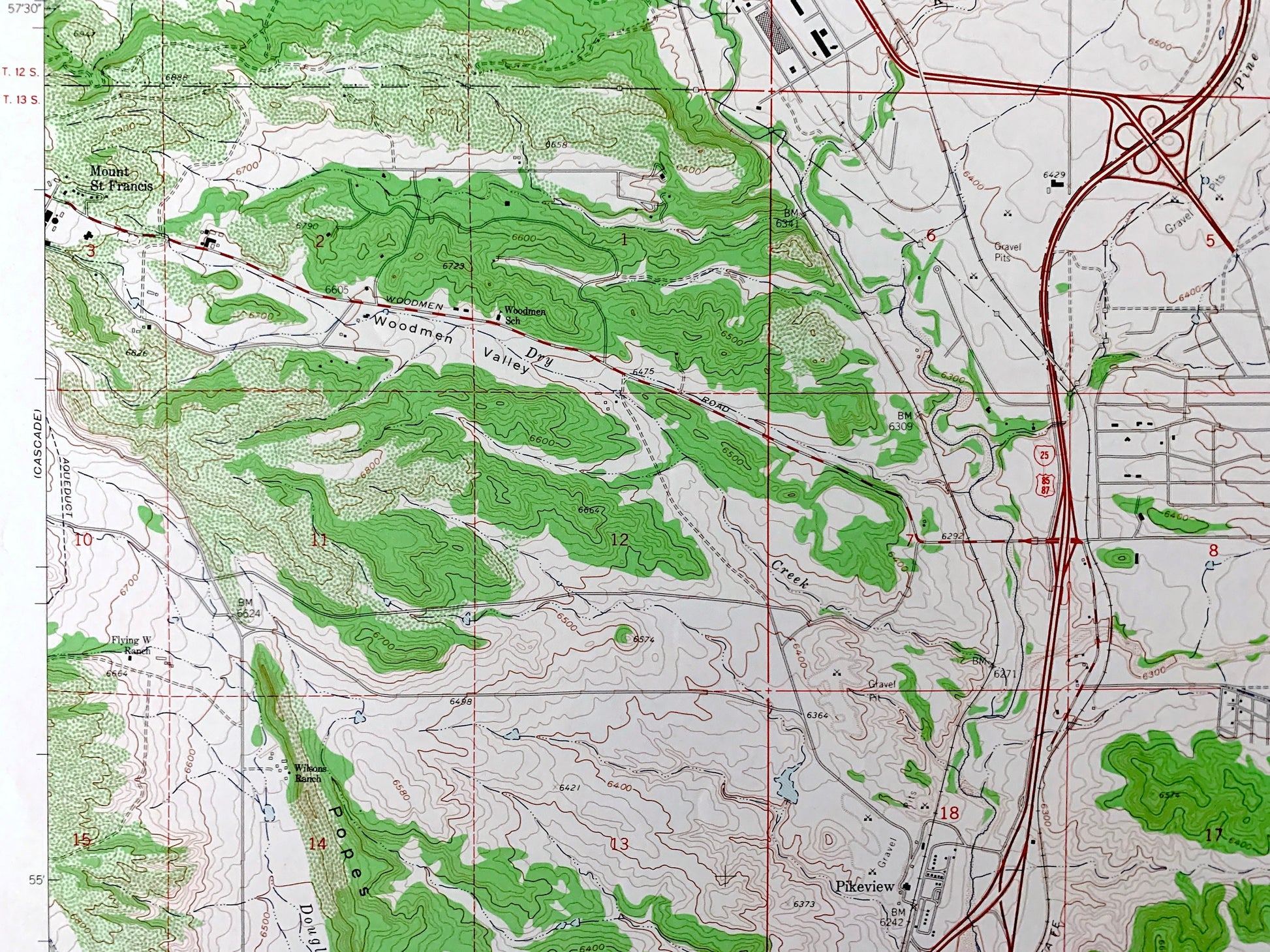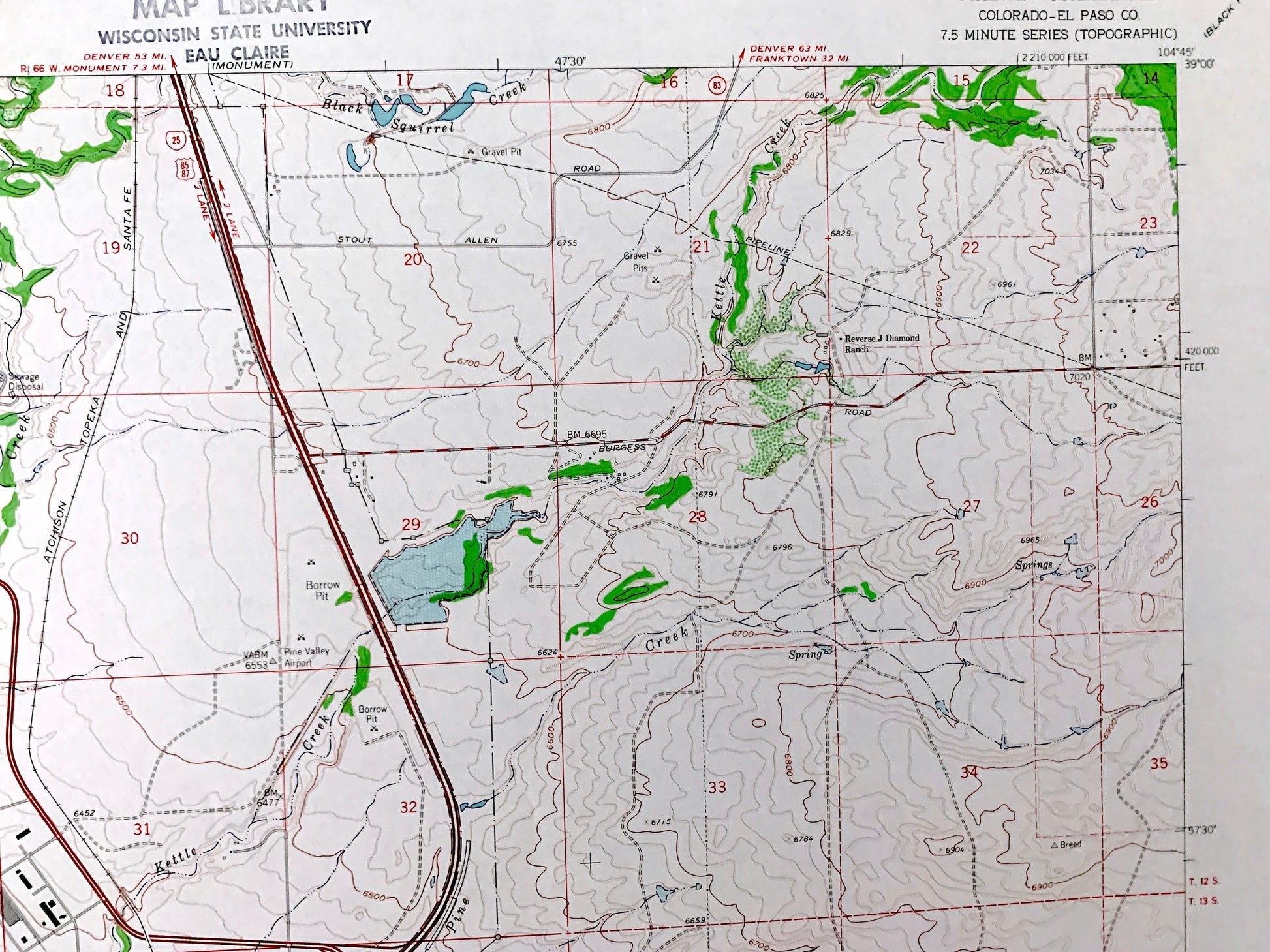 Points of Interest: United States Air Force Academy, Pine Valley Airpark, Palmer Park, Modern Woodmen of America Sanatorium, Cragmoor Sanitarium, Nichols Field, Garden Ranch Airpark, Popes Bluffs, Austin Bluffs, Pulpit Rock, Templeton Gap, The Mesa, Monument Creek, Kettle Creek, Dry Creek, Pine Creek, Black Squirrel Creek, Douglas Creek, Shooks Run, and many more hills, streams, ponds, houses, schools, railroads, churches and roads.