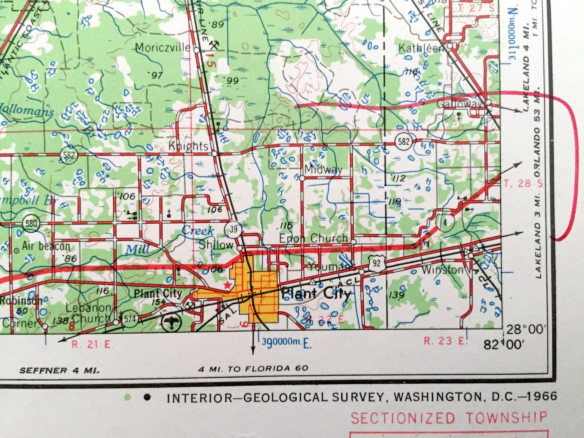 Beautiful, antique map of Plant City, Florida and surrounding areas. This is an authentic 1955 edition, 1965 print from the U.S. Geological Survey and NOT a computer reproduction.