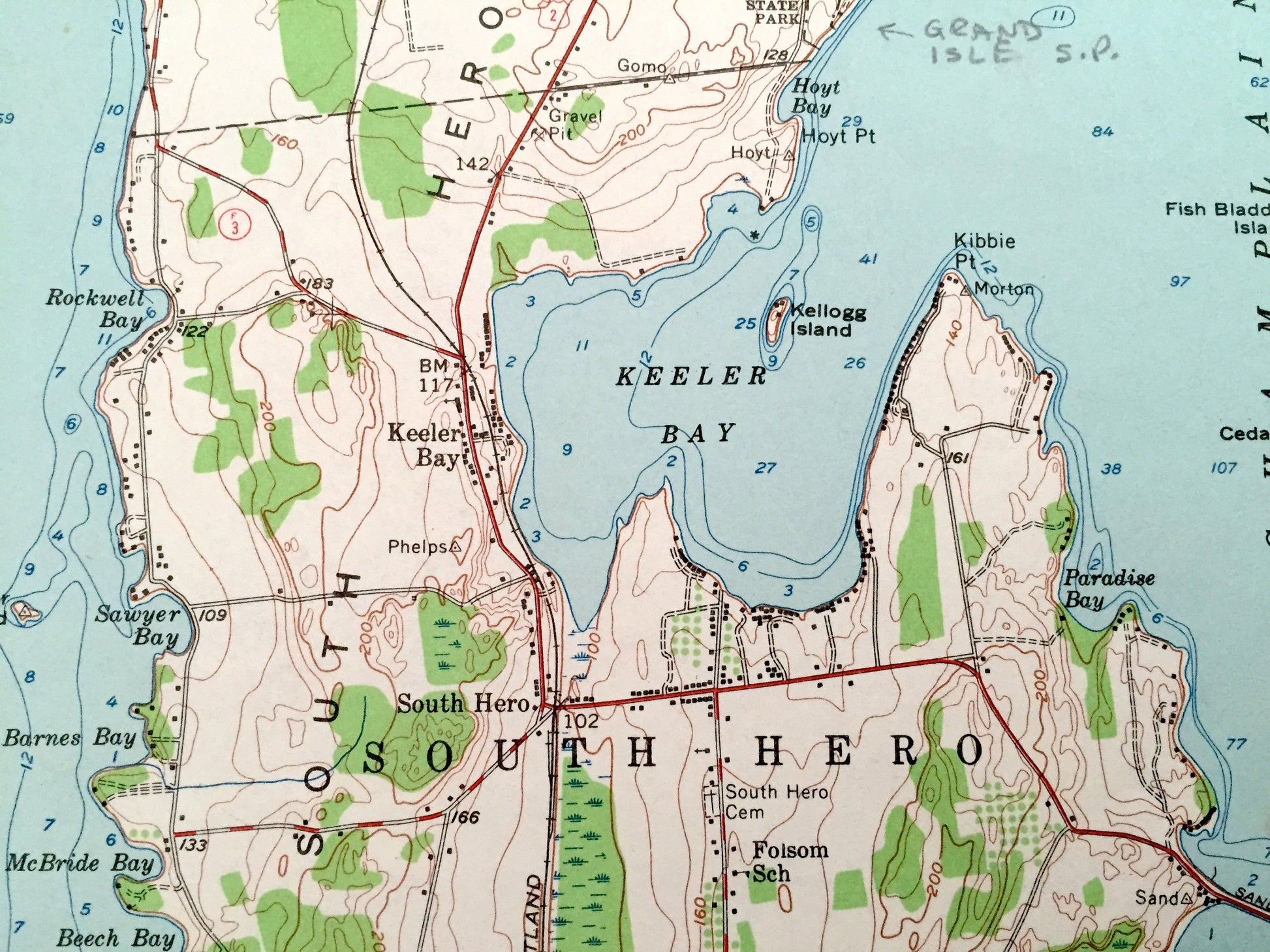 Points of Interest: Lake Champlain, Valcour Island, Crab Island, Plattsburgh Air Force Base, Cumberland Bay, Cumberland Head, South Hero Island, Keeler Bay, Appletree Point, Saranac River, Salmon River, Ausable River, Adirondack State Park, Winooski River, Derway Island, Bellarmine College and many more rivers, hills, islands, bays, roads, railroads, houses, churches.