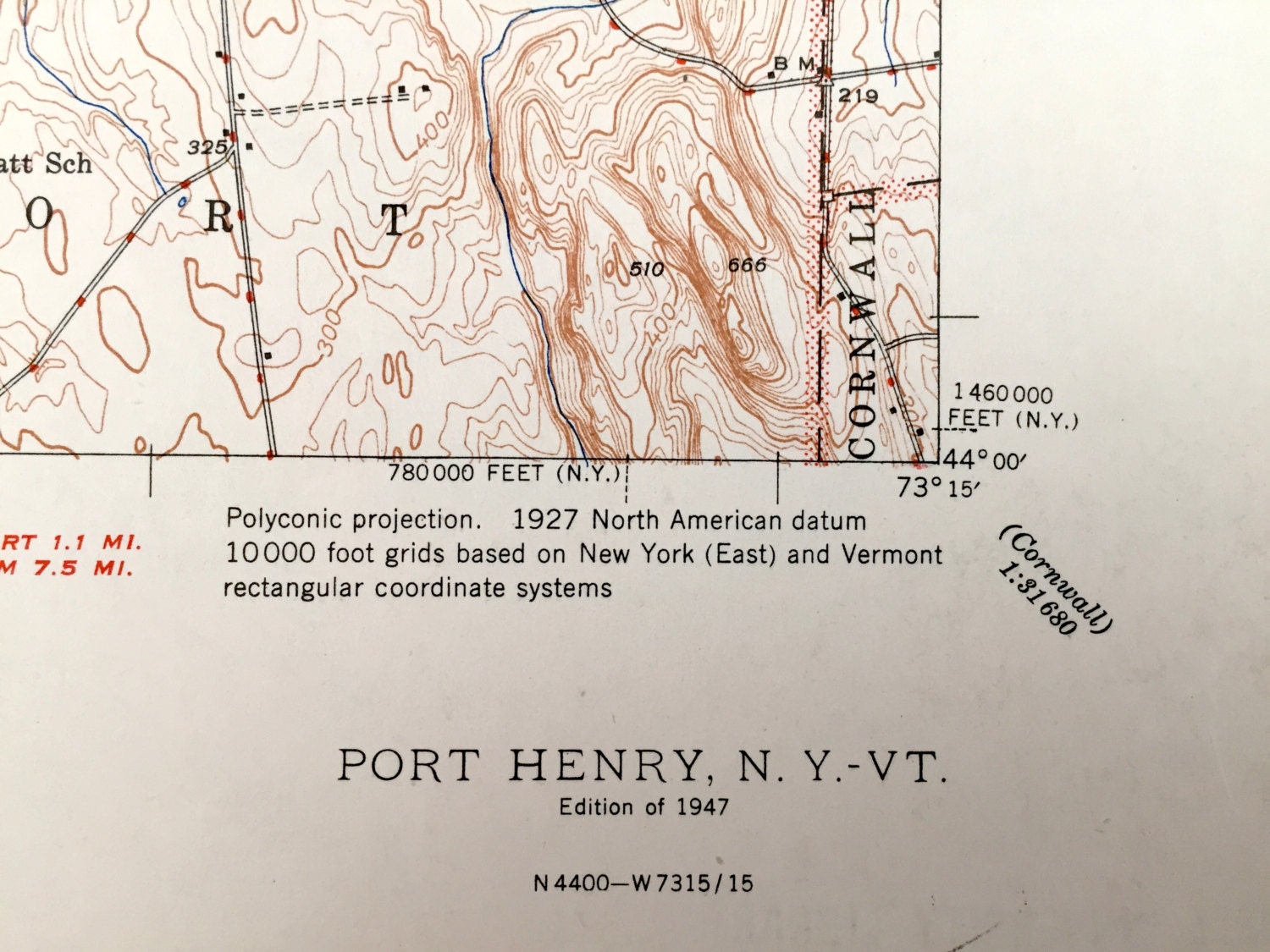 See what the Lake Champlain, New York and Vermont looked like more than 75 years ago. Lots of intricate details and geological contours. Map even has little squares for every house that existed at the time. The USGS cartographers were very thorough back then! On the back is a description of topographic symbols and map guide.