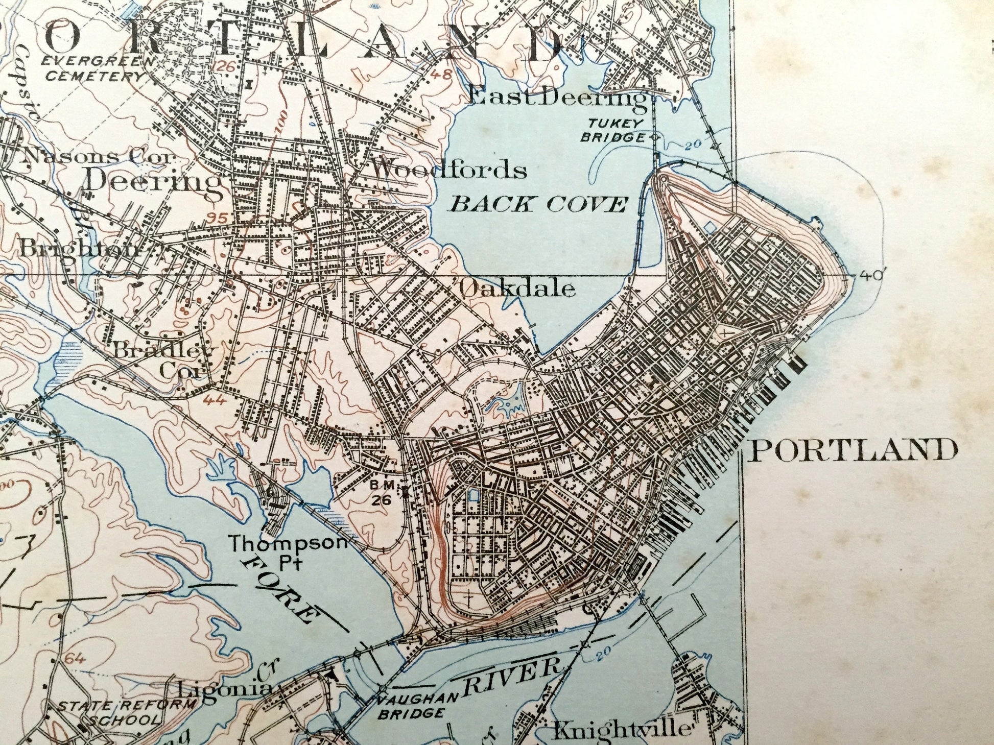 Points of Interest: Cumberland County, Back Cove, Fore River, Presumpscot River, Stroudwater River, Long Creek, Portland International Jetport, Riverside Golf Course, Piscataqua River, Rocky Hill, Lorenzen Hill, Highland Lake, Portland Harbor, Running Hill, Maine Central Railroad Graves Hill, Canadian National Railroad and lots more hills, creeks, towns, schools, churches, cemeteries, roads and train tracks.