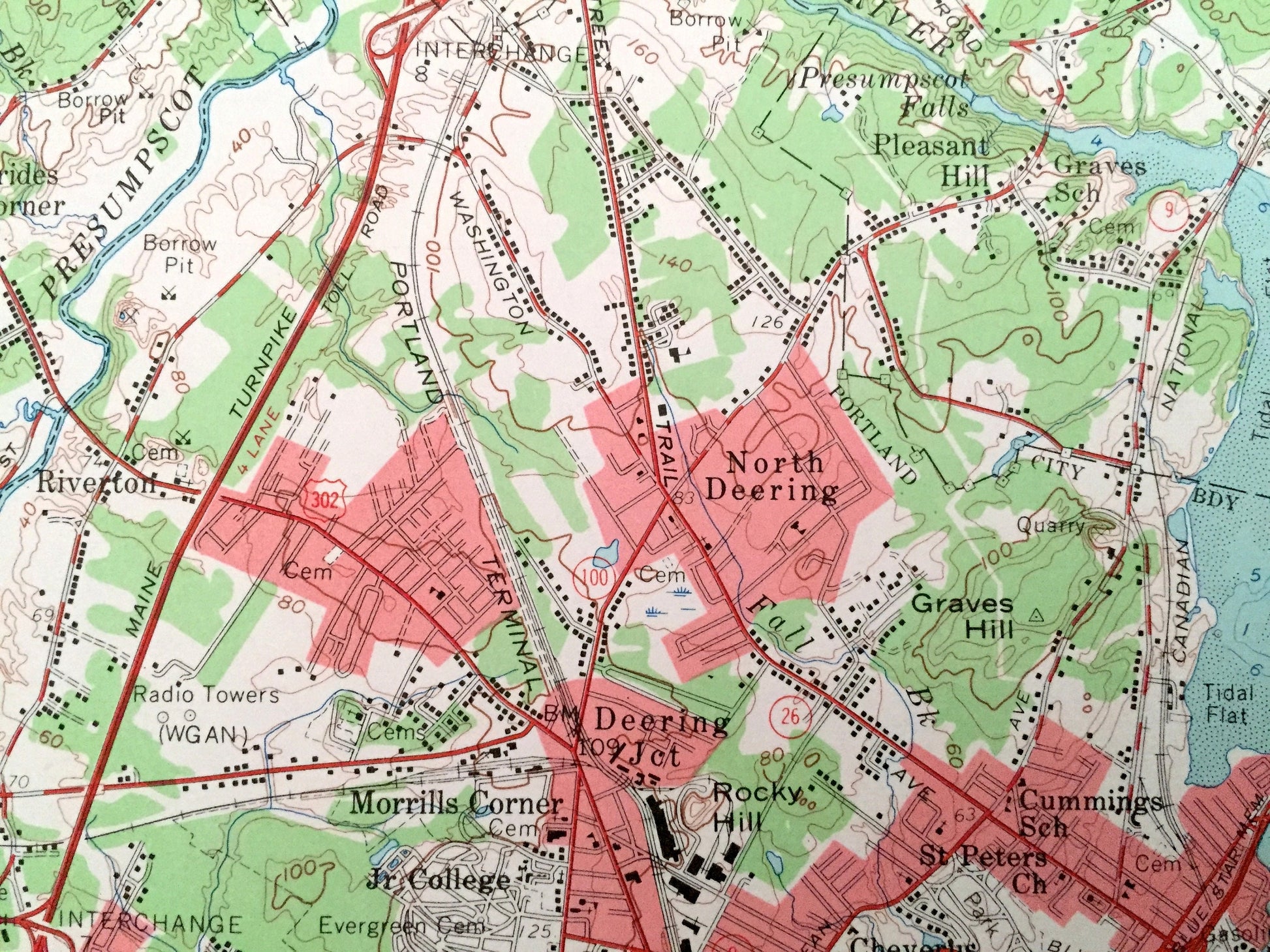 Points of Interest: Cumberland County, Back Cove, Fore River, Presumpscot River, Stroudwater River, Long Creek, Portland International Jetport, Riverside Golf Course, Piscataqua River, Rocky Hill, Lorenzen Hill, Highland Lake, Portland Harbor, Running Hill, Maine Central Railroad Graves Hill, Canadian National Railroad and lots more hills, creeks, towns, schools, churches, cemeteries, roads and train tracks.