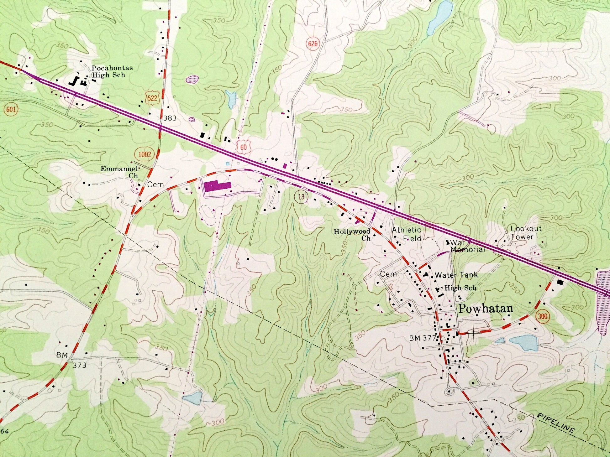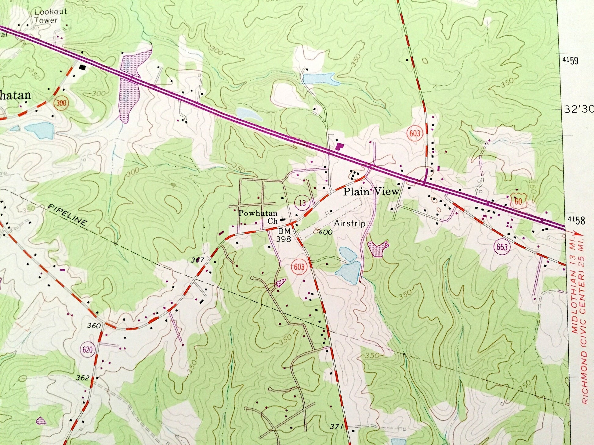 Beautiful, antique map of Powhatan, Virginia and surrounding Powhatan County area. This is an authentic 1966 edition, 1977 print from the U.S. Geological Survey and NOT a computer reproduction.