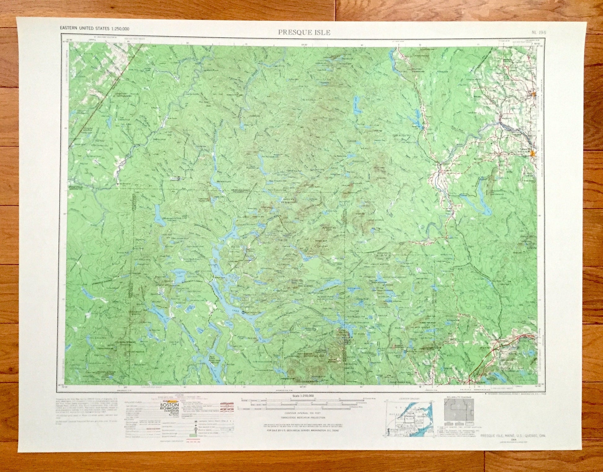 Beautiful, antique map of Presque Isle, Maine and surrounding Quebec, Canada areas. This is a 1954 edition, 1968 print from the U.S. Geological Survey and NOT a computer reproduction.