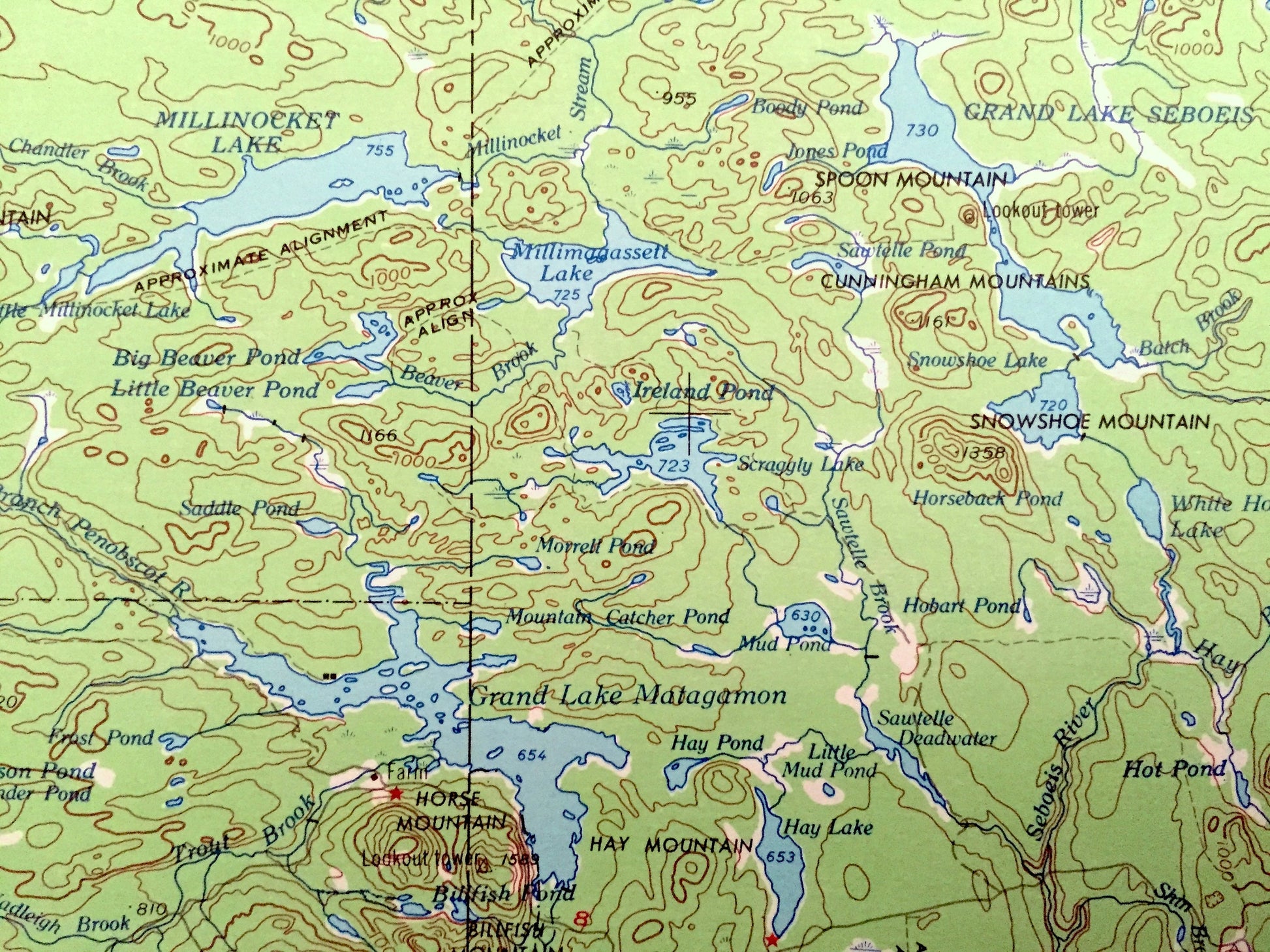 Points of Interest: MAINE - Chamberlain Lake, Millinocket Lake, Squa Pan Lake, Portage Lake, Allagash River, Aroostook River, Baxter State Park, Gero Island State Game Refuge, Mount Chase, and lots more hills, mountains, lakes, rivers, creeks, roads, highways and railroads.