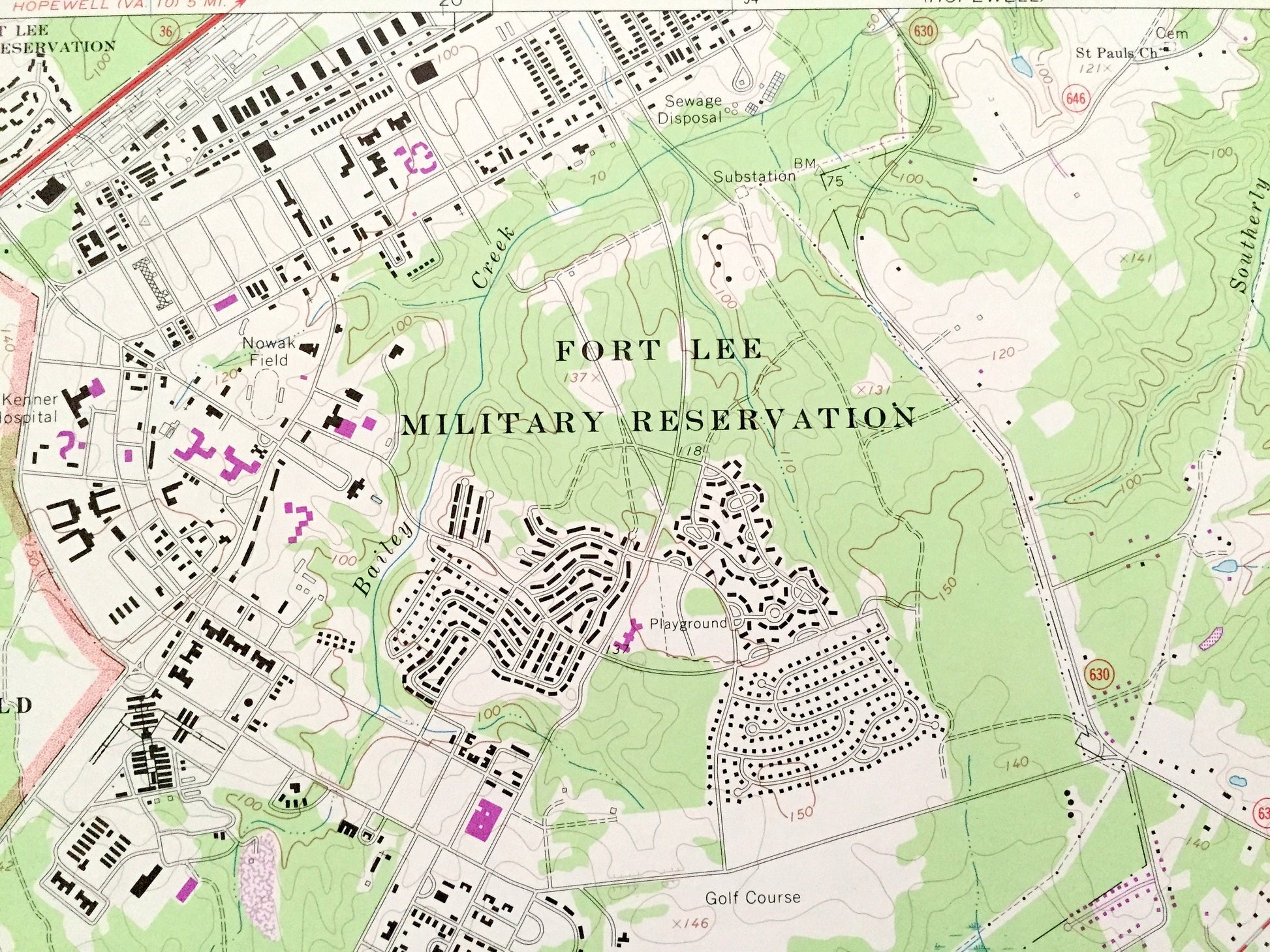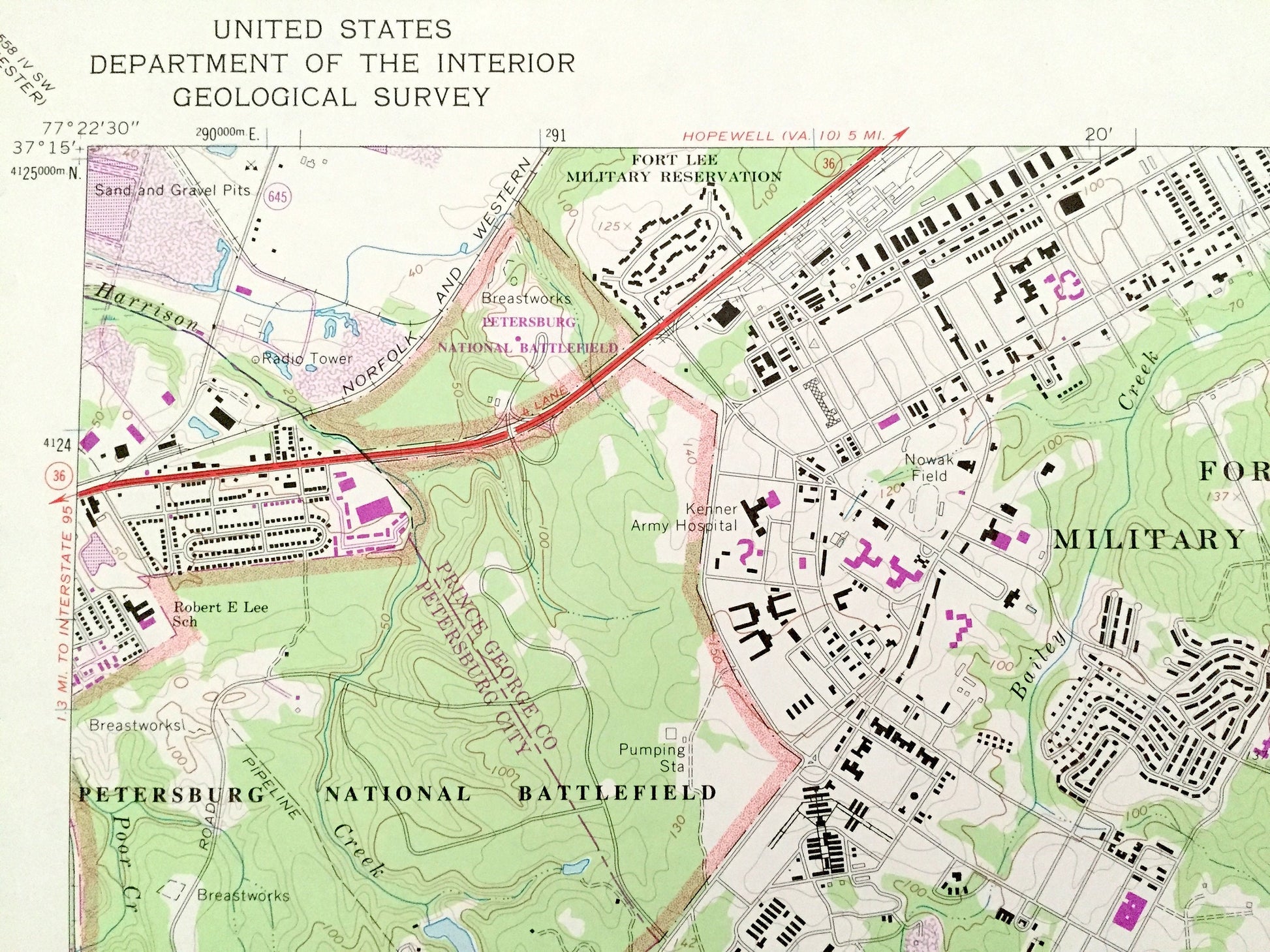 Points of Interest: Prince George County, Fort Lee US Army Military Reservation, Petersburg National Battlefield, Hanzlik Pond, Izaak Walton Pond, Bakers Pond, Woodys Pond, Blackwater Swamp and many more hills, streams, ponds, houses, schools, churches and roads.