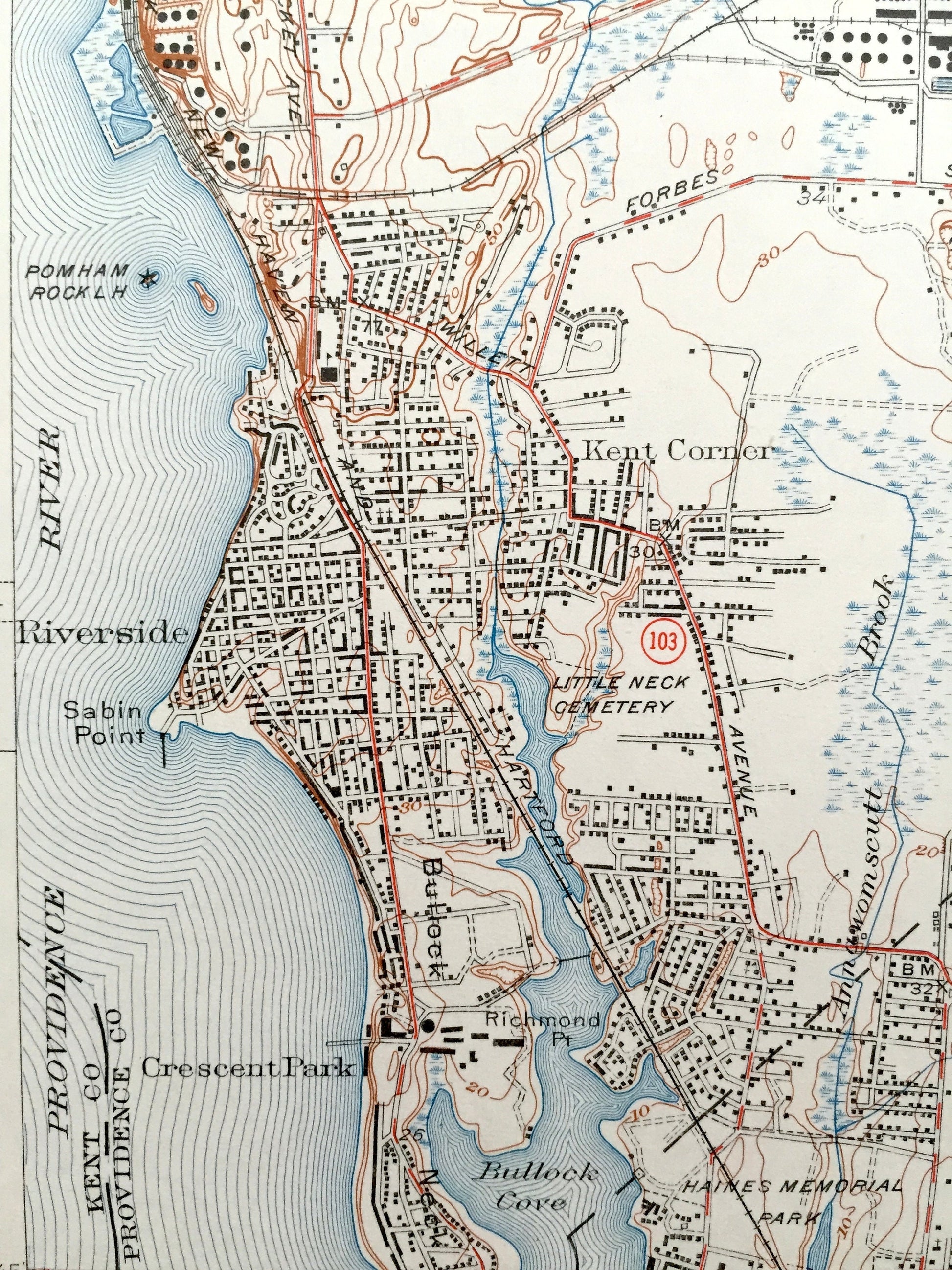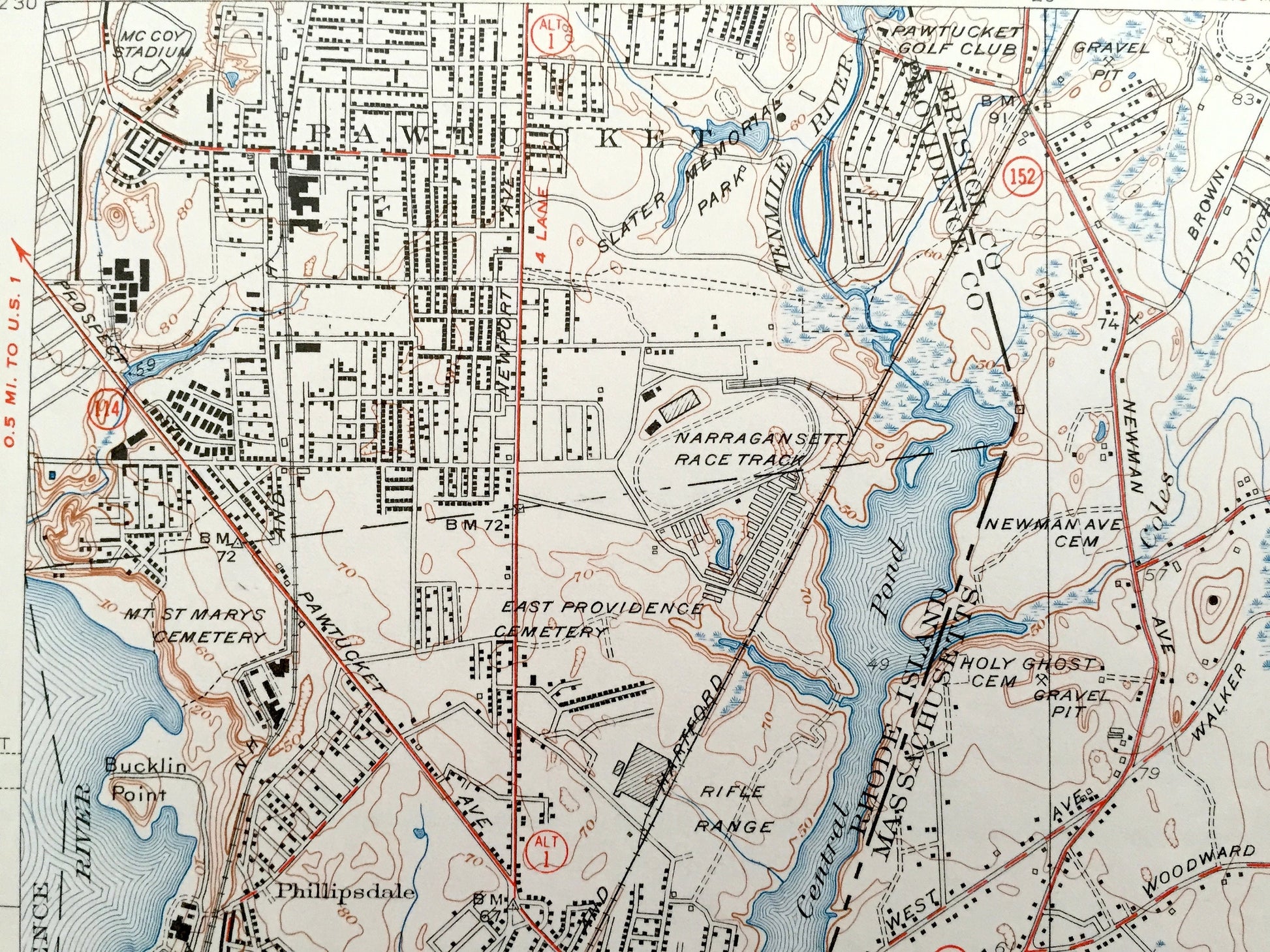 Points of Interest: Providence County, Seekonk River, Narragansett Bay, Barrington River, Warren River, Central Pond, Omega Pond, Shoe Factory Pond, Hundred Acres Cove, Bullock Cove, East Providence Reservoir, Ten Mile River, Pawtucket Golf Club, Narragansett Race Track, Runnins River, Bullock Neck, and lots more hills, brooks, ponds, marshes, villages, islands, roads, bogs and train tracks.
