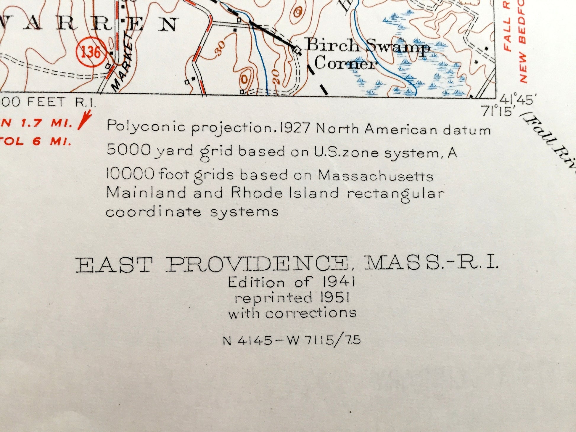 Beautiful, antique map of East Providence, Rhode Island and Seekonk and Rehoboth, Massachusetts area. This is an original 1941 edition, 1951 print from the U.S. Geological Survey and is NOT a computer reproduction.
