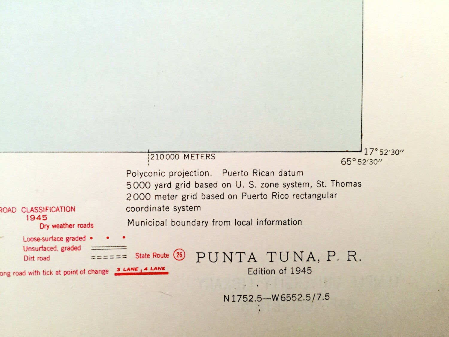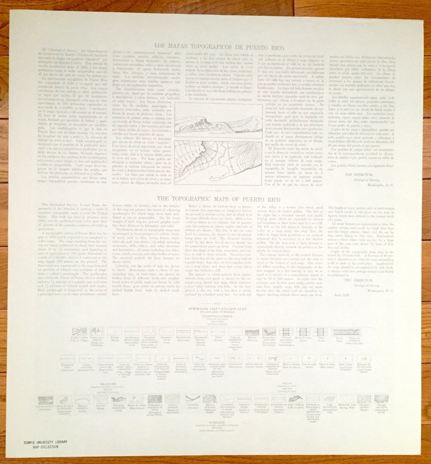See what the southeastern coast of Puerto Rico looked like more than 75 years ago. Lots of intricate details and geological contours. Map even has little squares for every house that existed at the time. The USGS cartographers were very thorough back then! On the back is a description of topographic symbols and map guide in both English and Spanish.