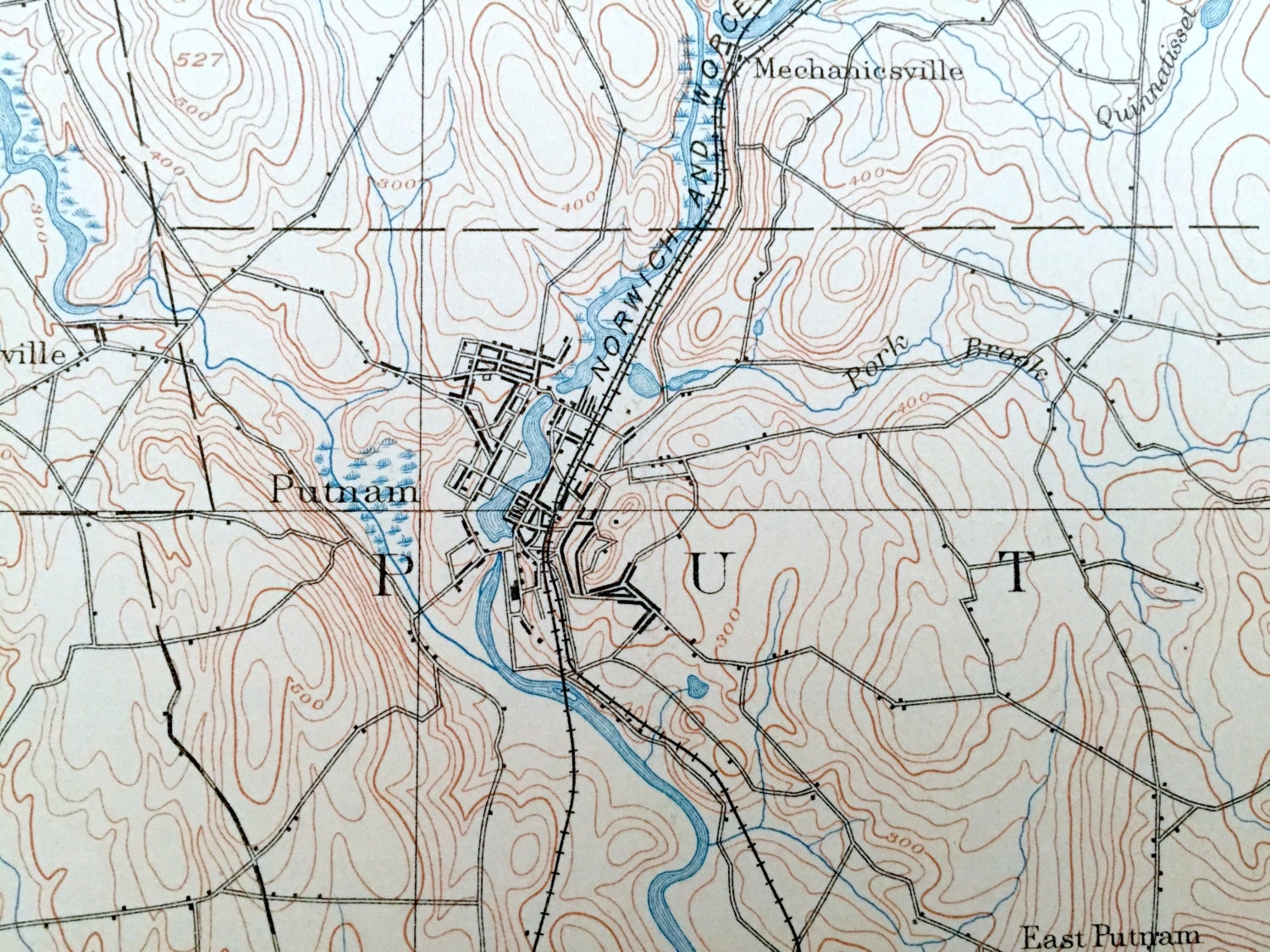 Beautiful, antique map of Putnam, Connecticut and surrounding Windham County area, including parts of Rhode Island. This is an authentic 1893 edition, 1910 print from the U.S. Geological Survey and NOT a computer reproduction.