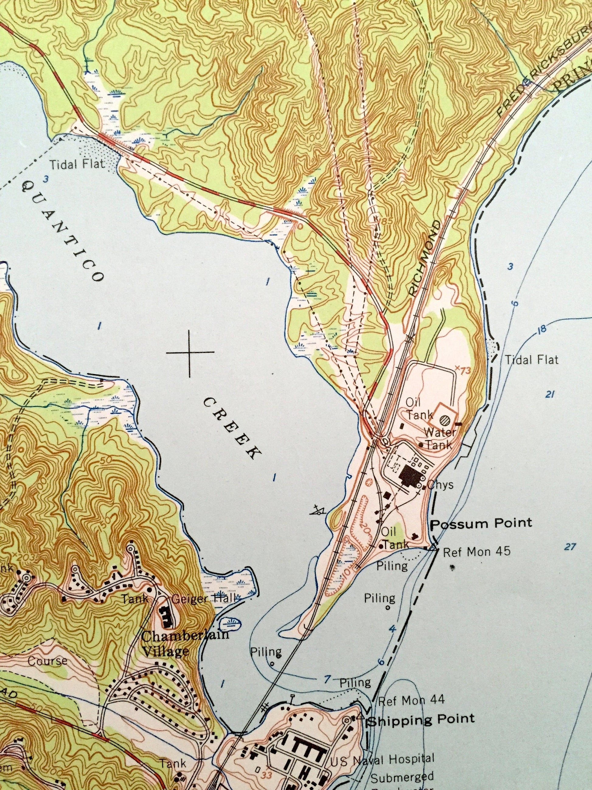 Points of Interest: Potomac River, Quantico Creek, Chopawamsic Creek, Quantico Marine Base, Goose Bay, Moss Point, Richmond Fredericksburg and Potomac Railroad, Possum Point, Powells Creek, Neabsco Creek, and lots more streams, marshes, houses, roads and railroads.