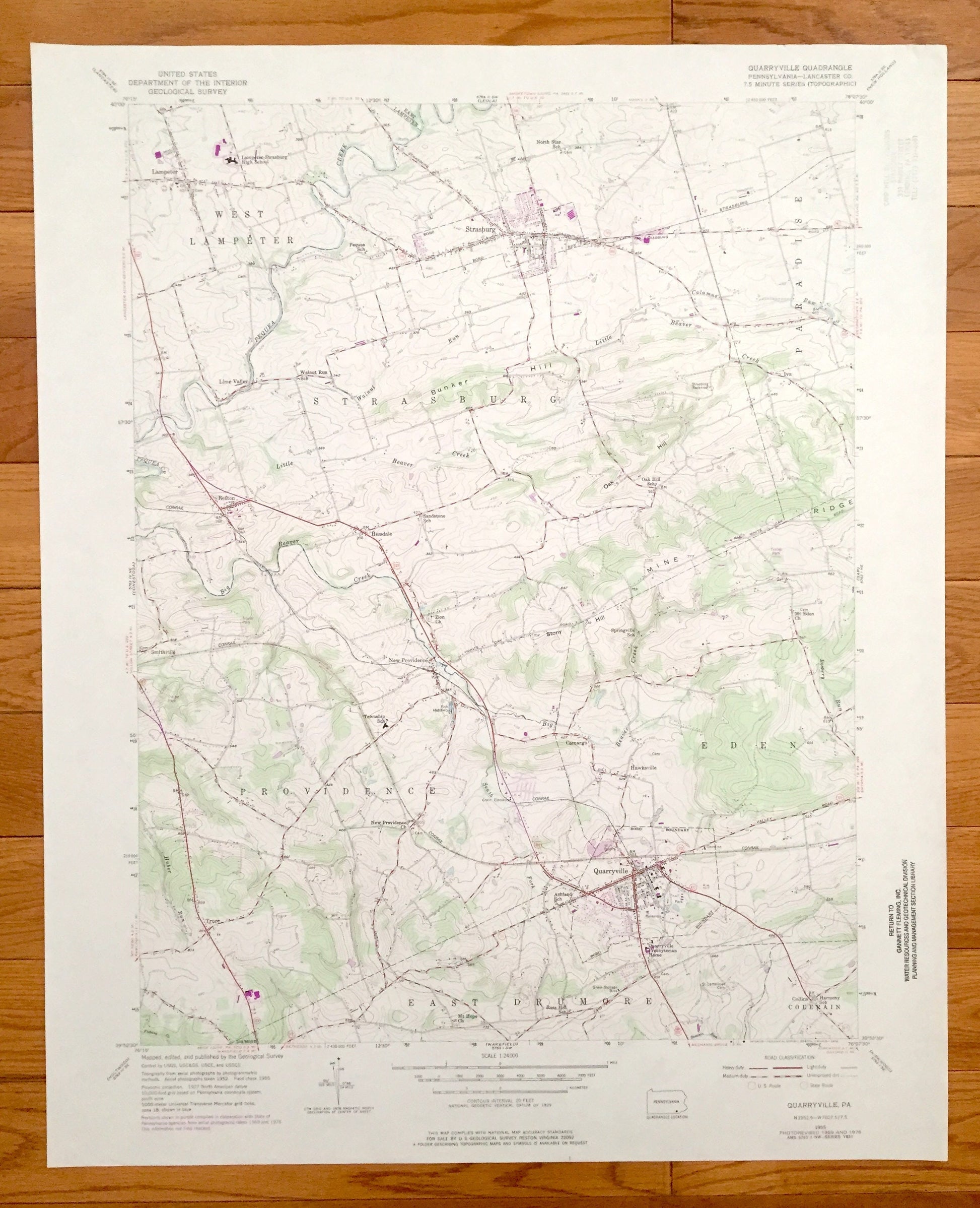 Beautiful, antique map of Quarryville, Pennsylvania and surrounding Lancaster County area. This is an authentic 1955 edition, 1976 print from the U.S. Geological Survey and NOT a computer reproduction.