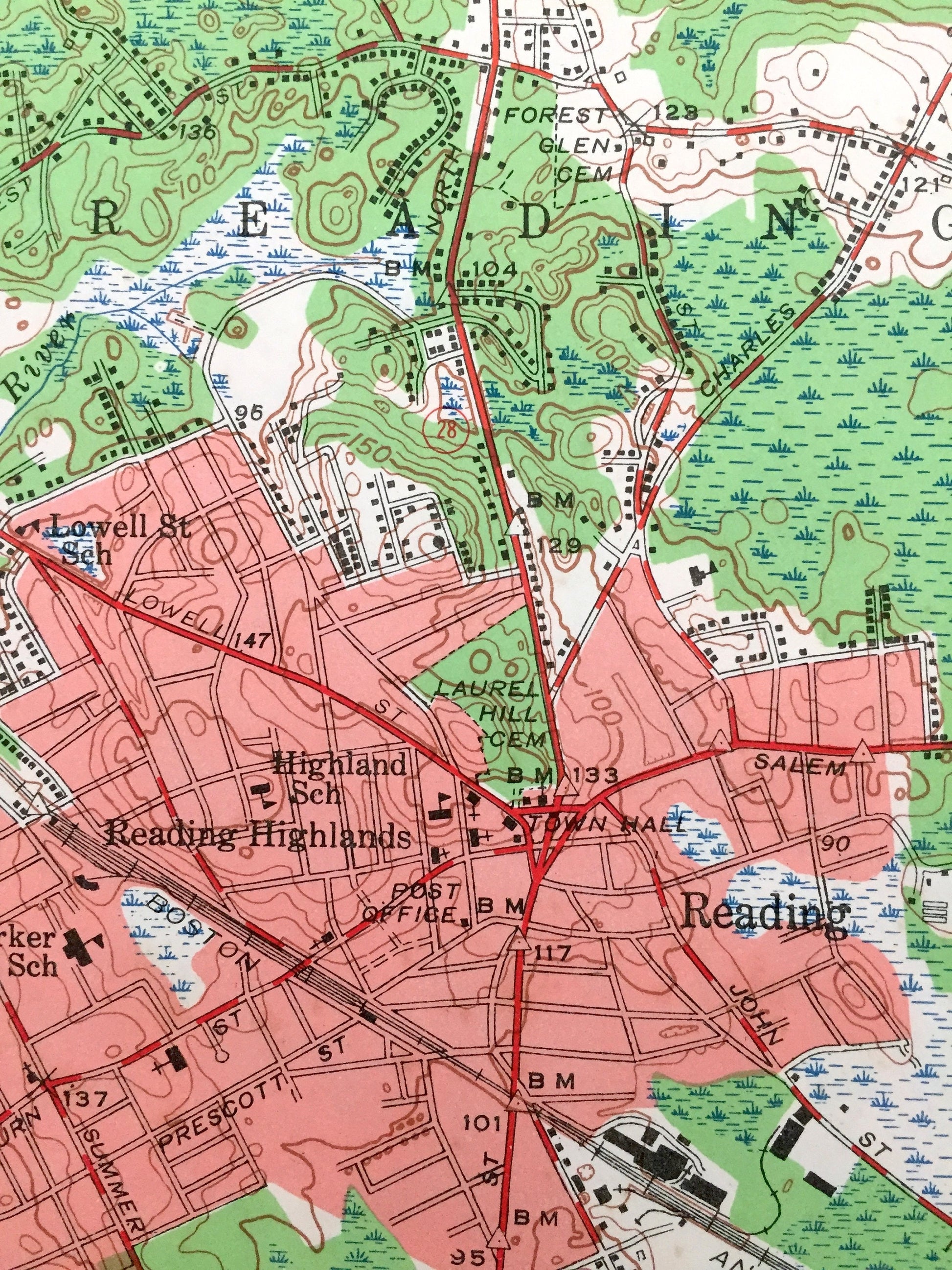 Points of Interest: Cedar Swamp, Middleton Pond, Lake Quannapowitt, Pilling Pond, Swan Pond, Military Police Camp, Uptons Hill, Wills Brook, Hawkes Pond, Mill Meadown, Ipswich River, Devils Dishfull Pond, Waldens Hill, Martins Pond, Ponde One, Salem Pond, Lynn Woods, and lots more, hills, brooks, ponds, marshes, roads and train tracks.