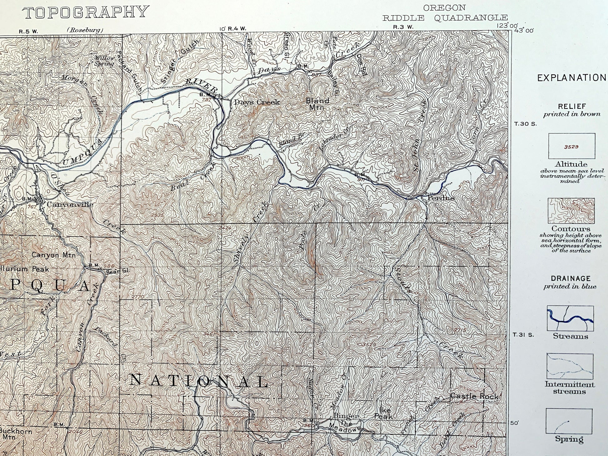 Beautiful, antique map of Riddle, Oregon and surrounding Douglas, Josephine and Jackson County area. This is an authentic 1904 edition, 1923 print from the U.S. Geological Survey and NOT a computer reproduction.