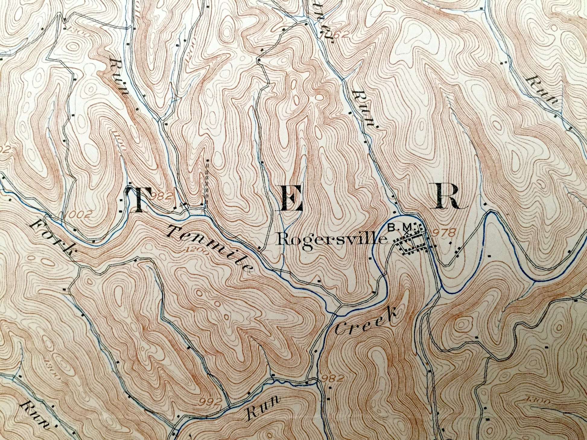 Beautiful, antique map of Rogersville, Pennsylvania and surrounding Greene and Washington County area. This is an authentic 1905 print from the U.S. Geological Survey and NOT a computer reproduction.