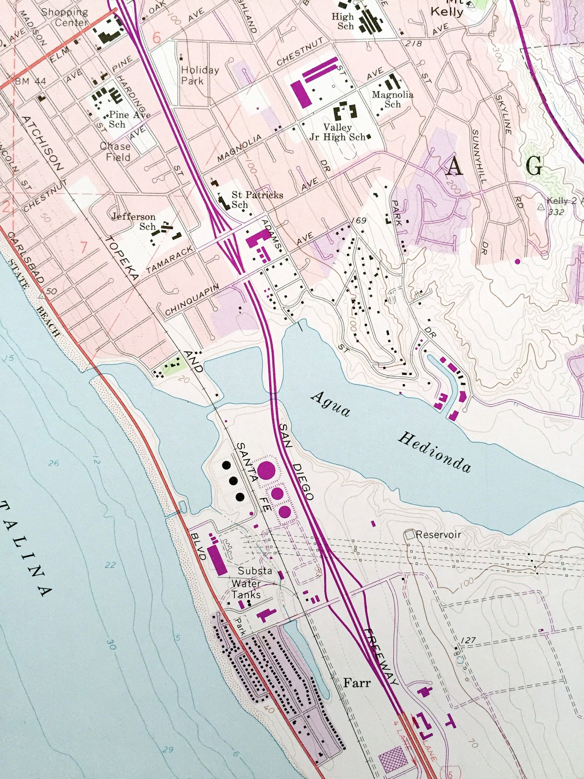 Points of Interest: Camp Pendleton Marine Corps Base, Santa Margarita y Las Flores, Gulf of Santa Catalina, Pacific Ocean, Atchison Topeka and Sata Fe Railroad, Buena Vista Lagoon, Mission Mountain, San Francisco Peak, Agua Hedionda, Lorna Alta Mountain, Palomar Airport, Fire Mountain, Eternal Hills Memorial Park, Wire Mountain, and lots more lakes, rivers, roads, creeks, lakes, small towns and roads.