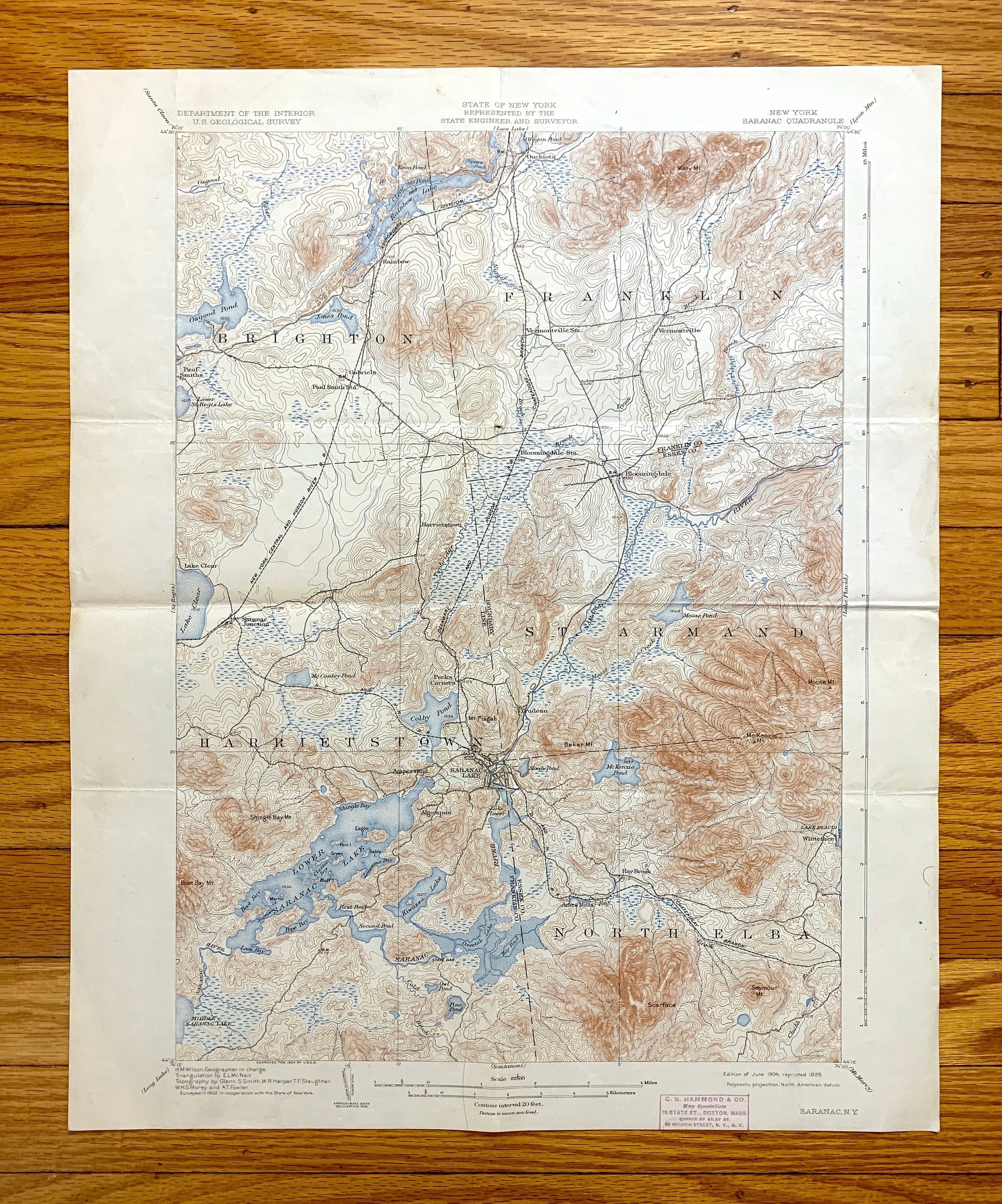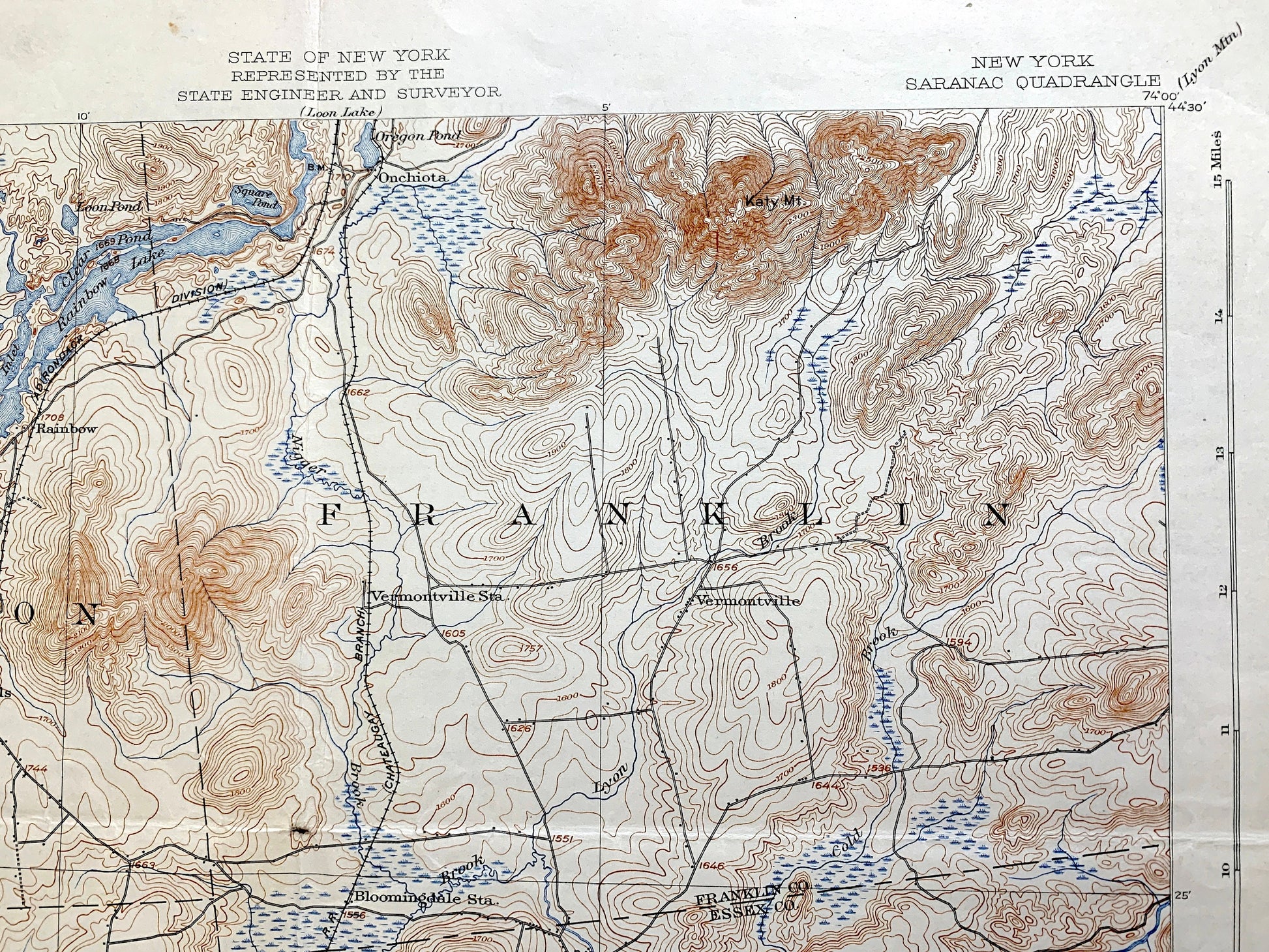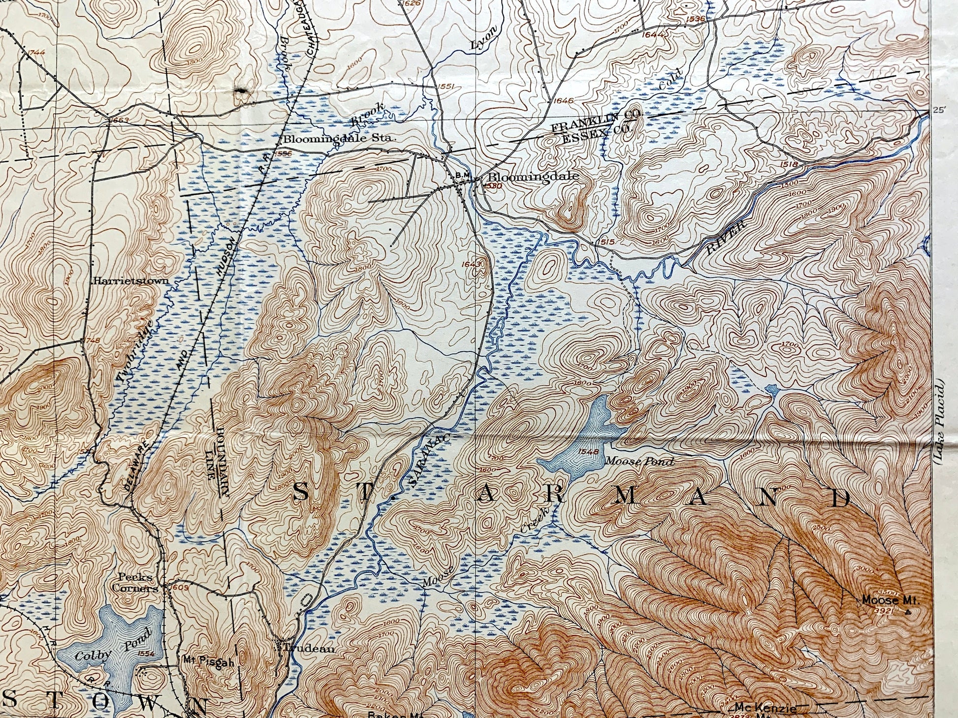 Beautiful, antique map of Saranac, New York and surrounding Franklin and Essex County area. This is an authentic 1904 edition, 1925 print from the U.S. Geological Survey and NOT a computer reproduction.