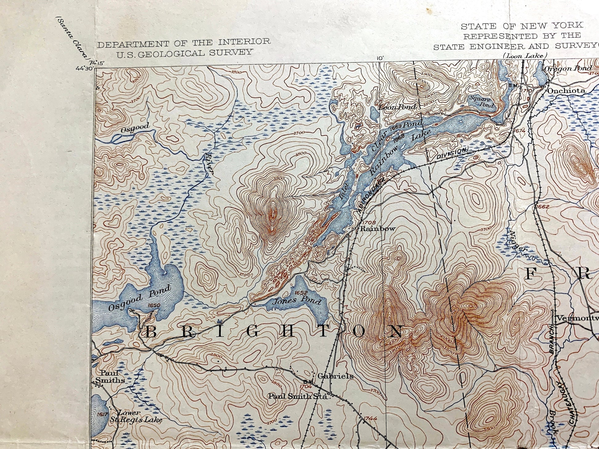 Bodies of Water: Essex County, Franklin County, Adirondacks, Lower Saranac Lake, Lake Colby, Lake Flower, Oseetah Lake, McKenzie Pond, Lake Clear, Osgood Pond, Rainbow Lake, Jones Pond, Moose Pond, Lake Placid, Saranac River, Ray Brook, Osgood River, Lyon Brook, Mose Mountain, Brewster Mountain, Scarface, Seymour Mountain, Skiff Hill, Flue Hill, McKenzie Mountain, and many more lakes, ponds, islands, coves, hills, mountains, houses, train tracks, roads.