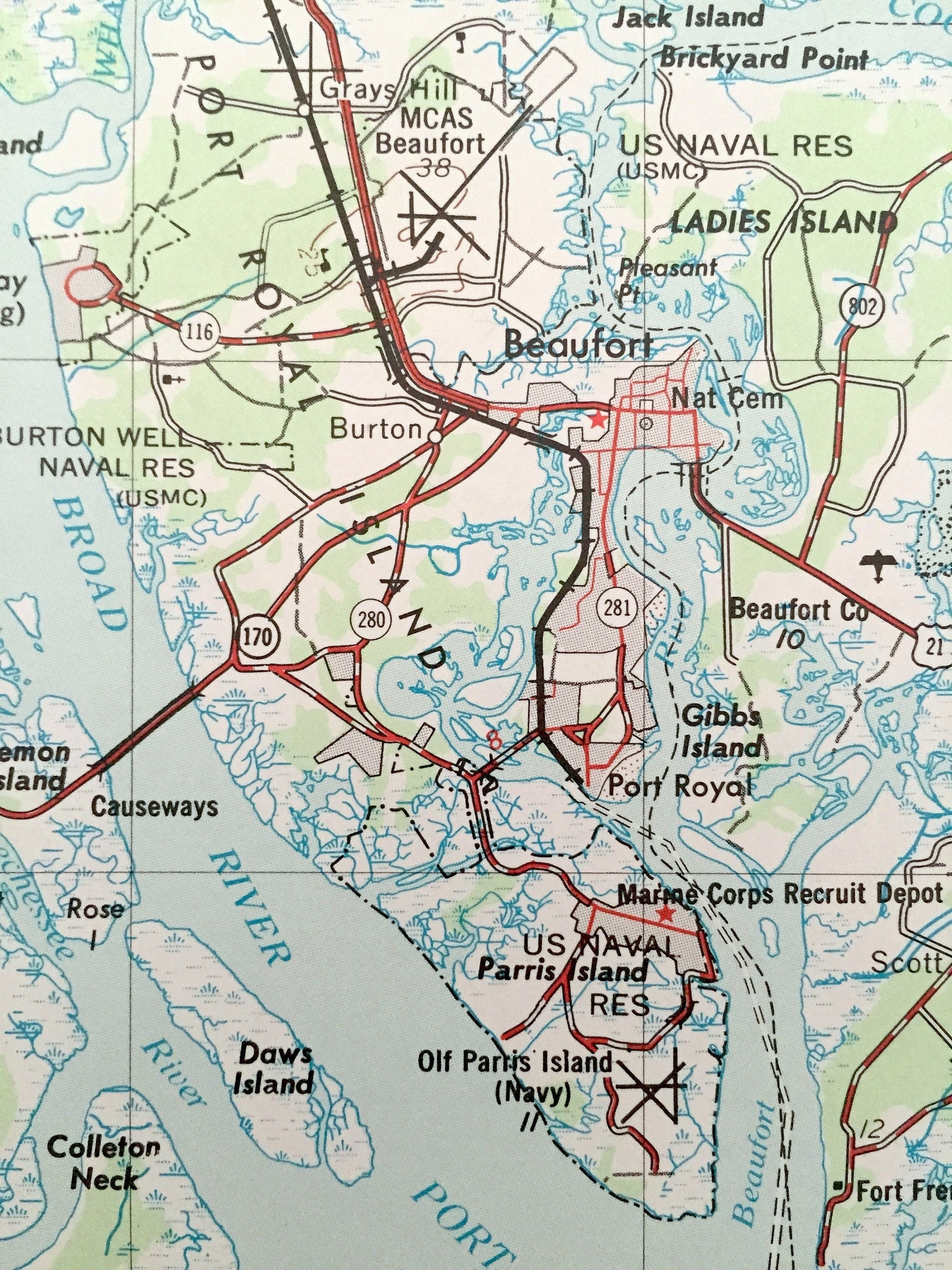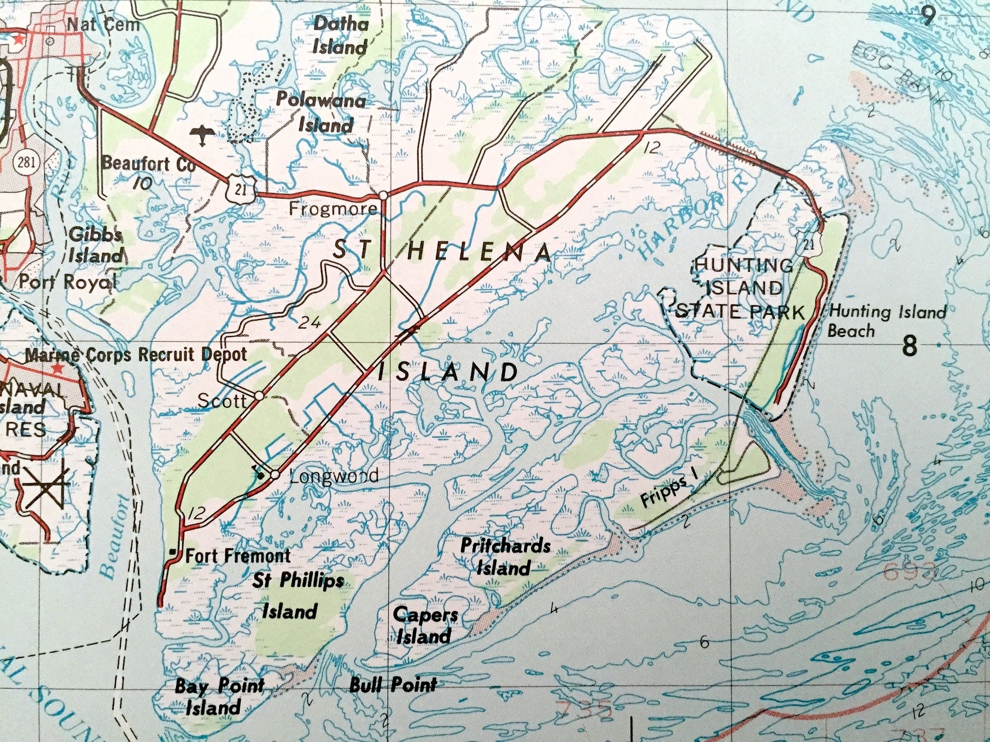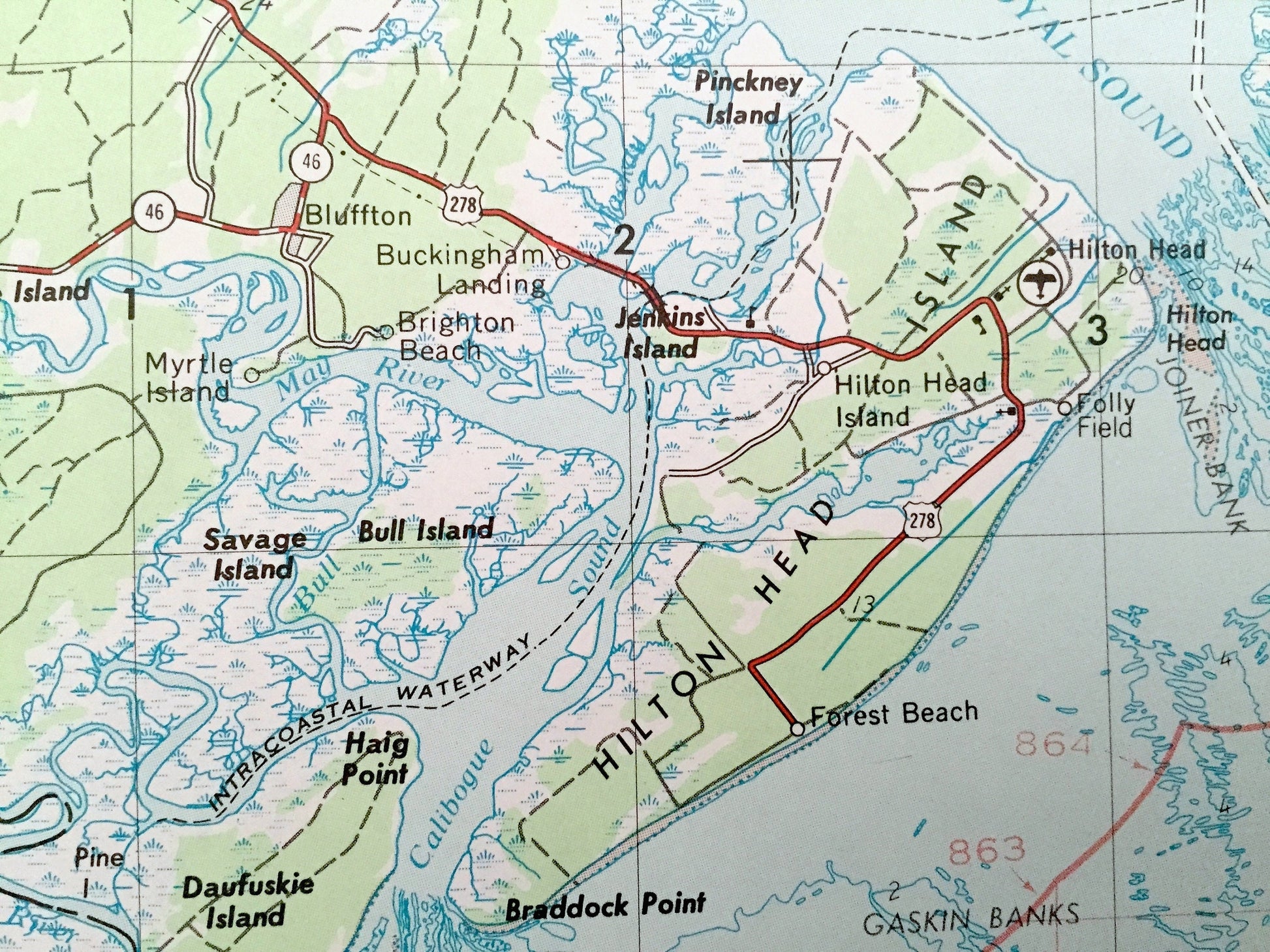 SOUTH CAROLINA - Atlantic Ocean, St. Helena Island, Port Royal Island, Edisto Island, Edisto Beach State Park, St. Helena Sound, Coosaw River, Broad River, Port Royal Sound, Savannah River and lots more hills, mountains, lakes, islands, bays, highways, railroads.