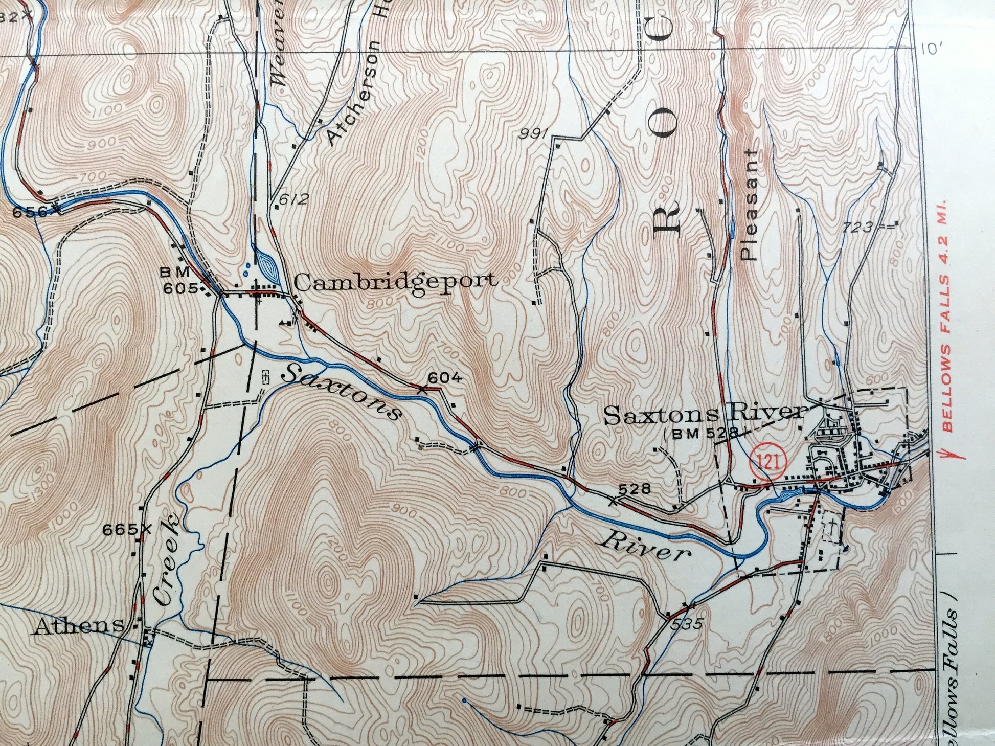 Beautiful, antique map of Saxtons River, Grafton, Windham, Chester, Athens, Westminster, Brookline, Townshend and Rockingham, Vermont. This is an authentic 1933 edition, 1948 print from the U.S. Geological Survey and NOT a computer reproduction.