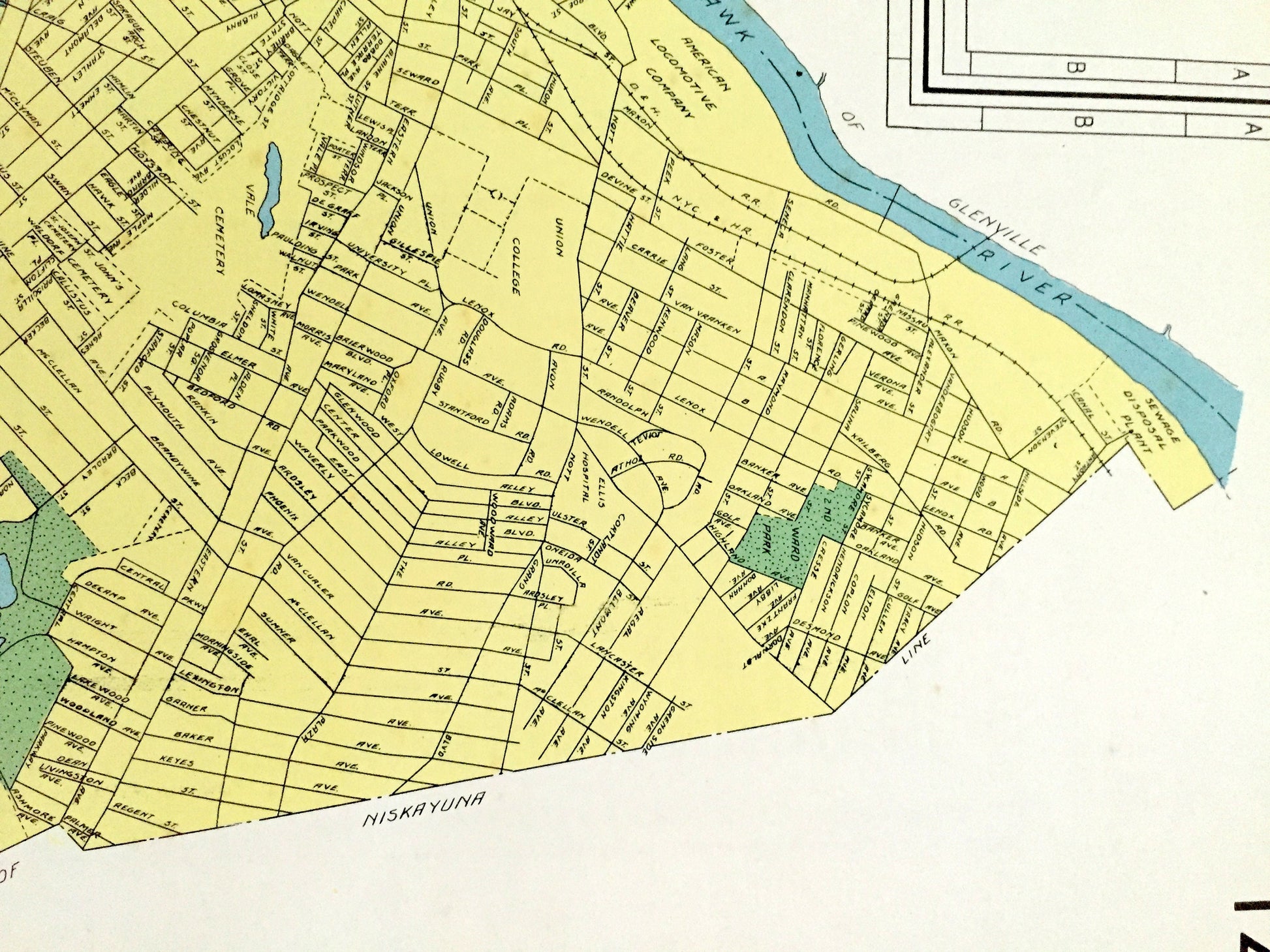 Beautiful, antique street map of the cities of Schenectady, Lackawanna & Plattsburgh, New York. This is an authentic print taken from the rare "Historical Atlas of New York State" by William P. Munger, published by Frank E. Richards Co. in 1941, and is NOT a computer reproduction.