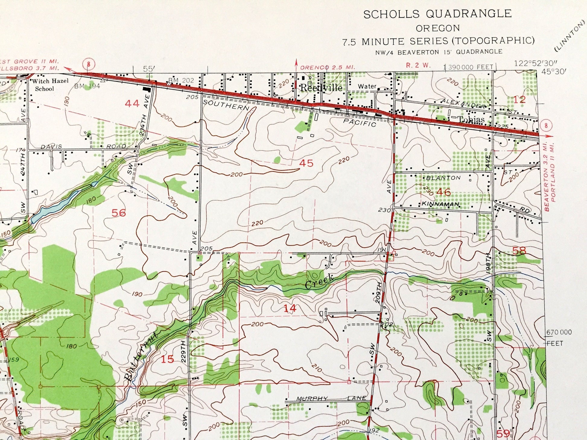 Points of Interest: Chehalem Mountains, Harris Bridge, Cooper Mountain, Laurel Ridge, Tualatin River, Butternut Creek, Christensen Creek, Burris Creek, McFee Creek, Heaton Creek, Baker Creek, and many more hills, streams, ponds, houses, schools, railroads, churches and roads.