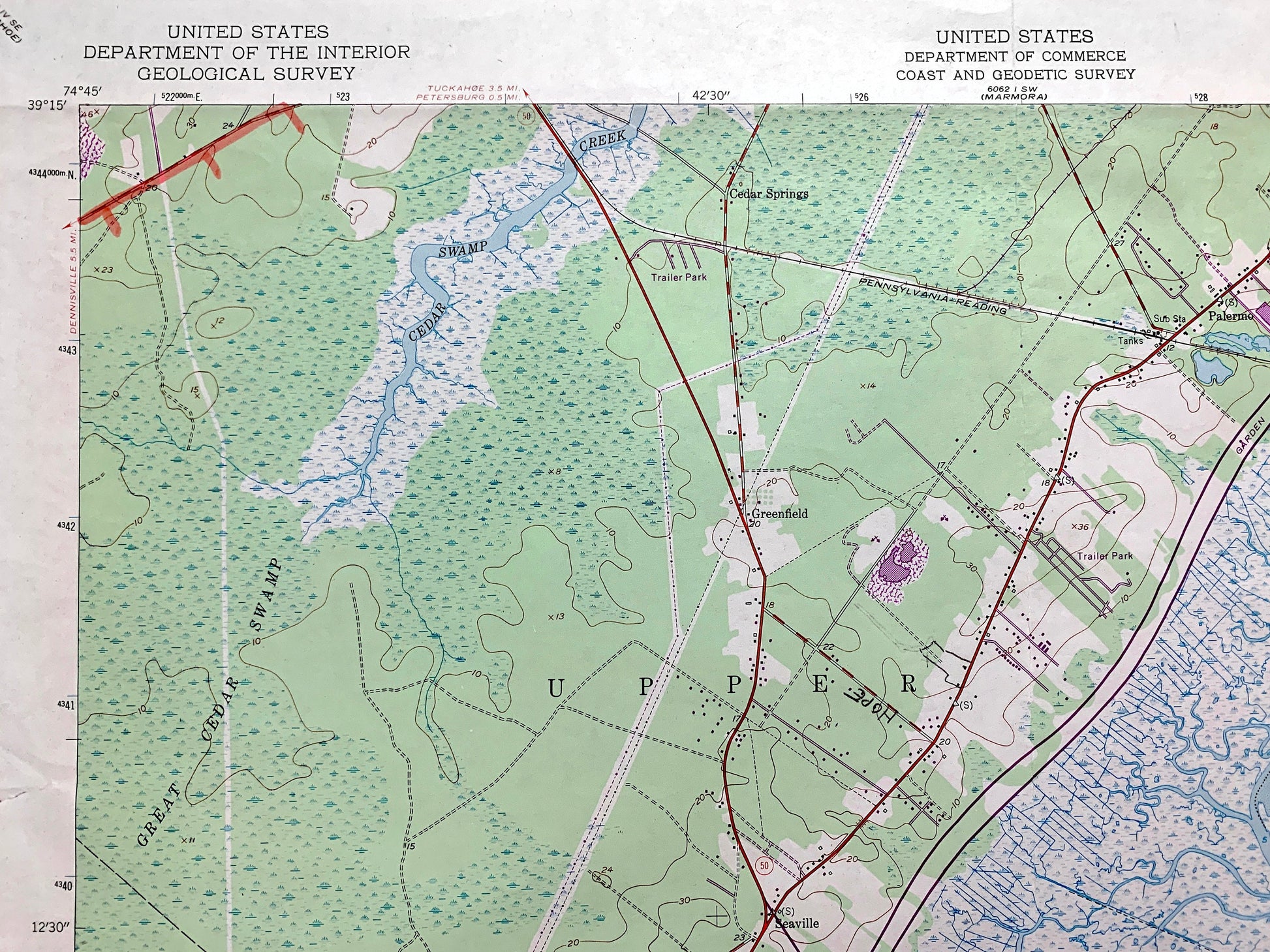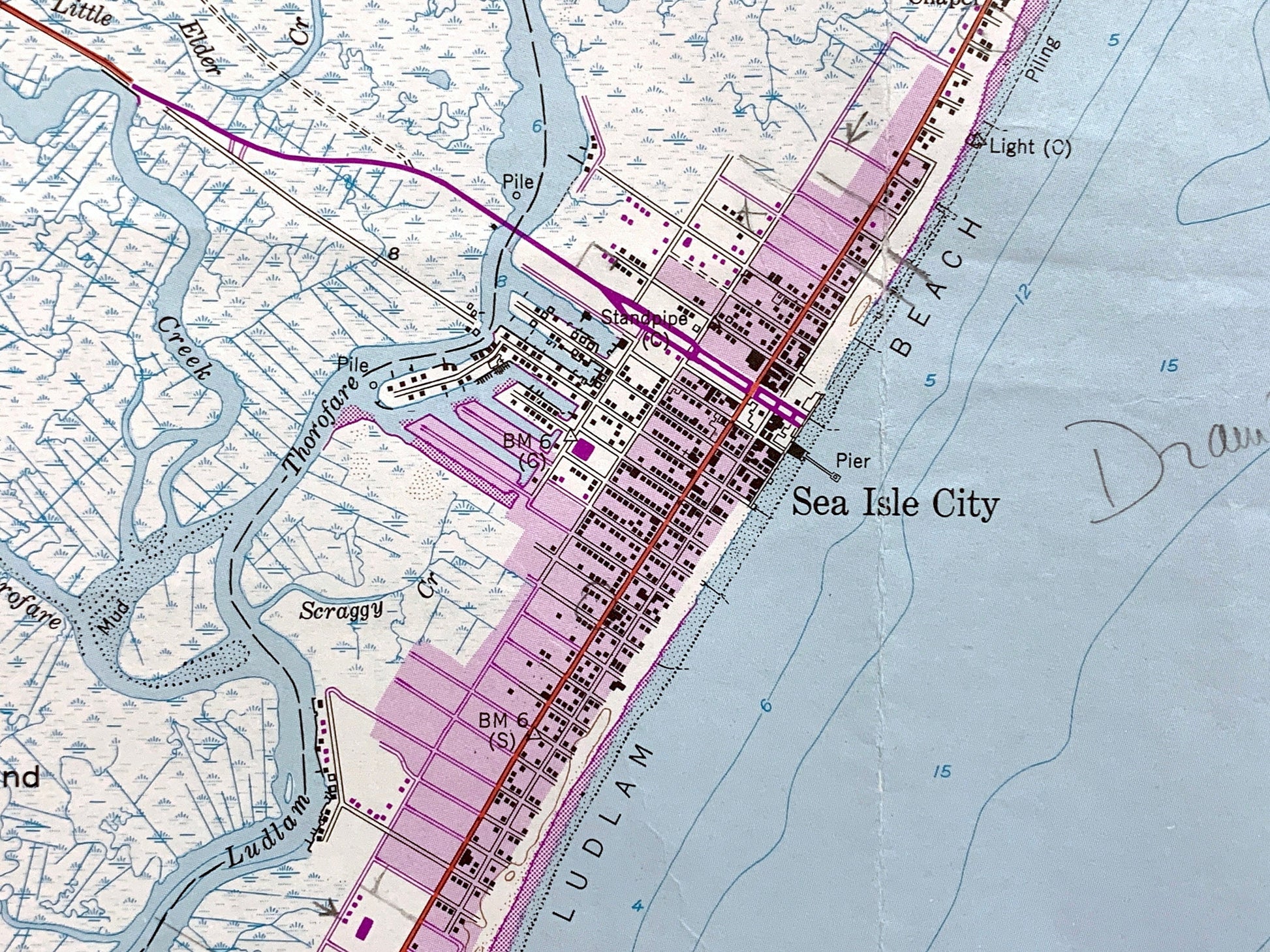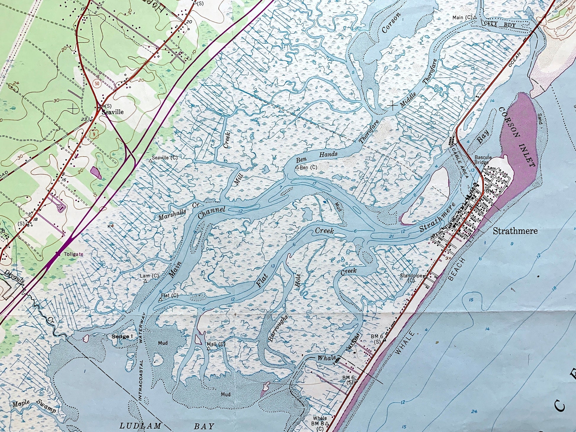 Points of Interest: Great Cedar Swamp, Cedar Swamp Creek, Atlantic Ocean, Corson Inlet, Townsends Inlet, Blackman Island, Devils Island, Gull Island, Peck Beach, Whale Beach, Ludlam Beach, Coast Guard Station, Seaside Cemetery, Townsend Sound, Ludlam Bay, Strathmere Bay, Intracoastal Waterway, Garden State Parkway, trailer parks, and many more roads, houses, beaches, islands, rivers, inlets, marshes, lighthouses and creeks.