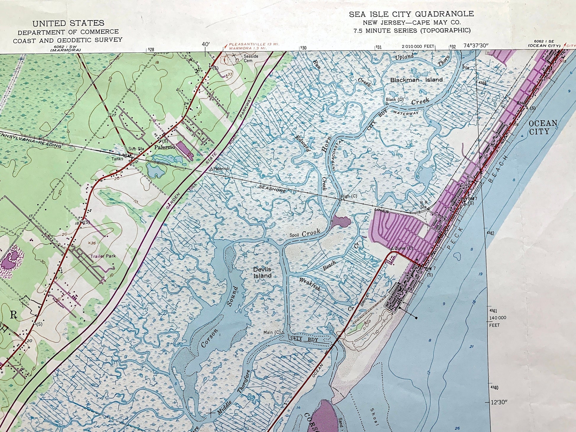 Beautiful, antique map of Sea Isle City, New Jersey and surrounding Cape May County area. This is an authentic 1952 edition, 1984 print from the U.S. Geological Survey and NOT a computer reproduction.