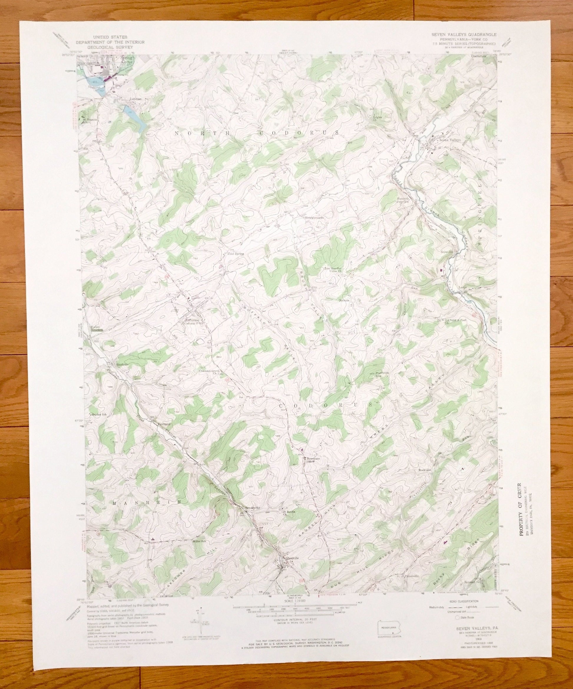 Beautiful, antique map of Seven Valleys, Pennsylvania and surrounding York County areas. This is an authentic 1953 edition, 1968 print from the U.S. Geological Survey and NOT a computer reproduction.