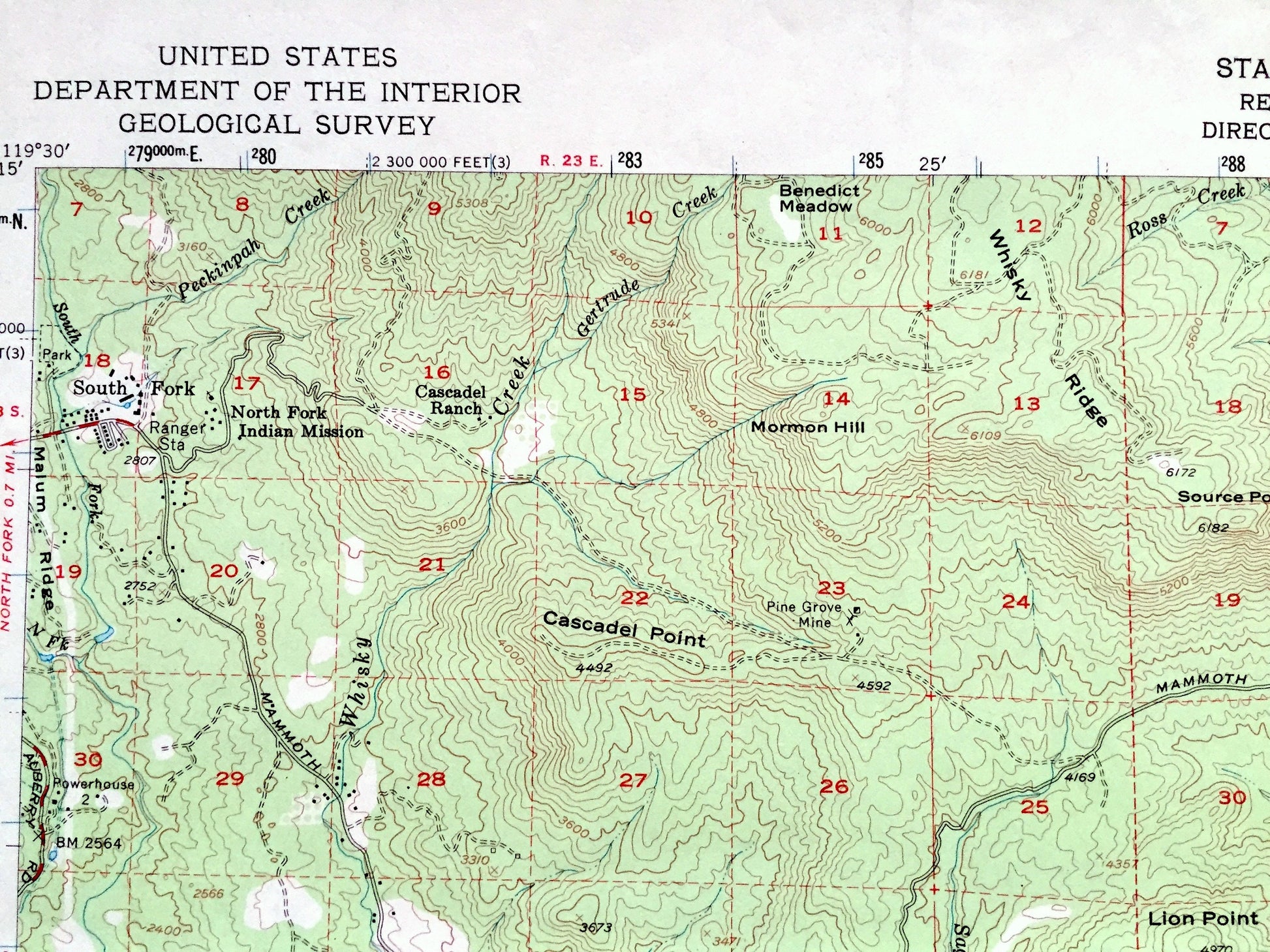 Points of Interest: Fresno County, Madera County, Shaver Lake, San Joaquin River, Sierra National Forest, Redinger Lake, Jose Basin, Big Sandy Valley, Kinsman Flat, Pine Ridge, Blue Canyon, Huntington Lake Game Refuge, Castle Peak, Bald Mountain, Burrough Mountain, Flume Peak, and many more hills, mountains, canyons, creeks, houses, roads, ranches and camps.