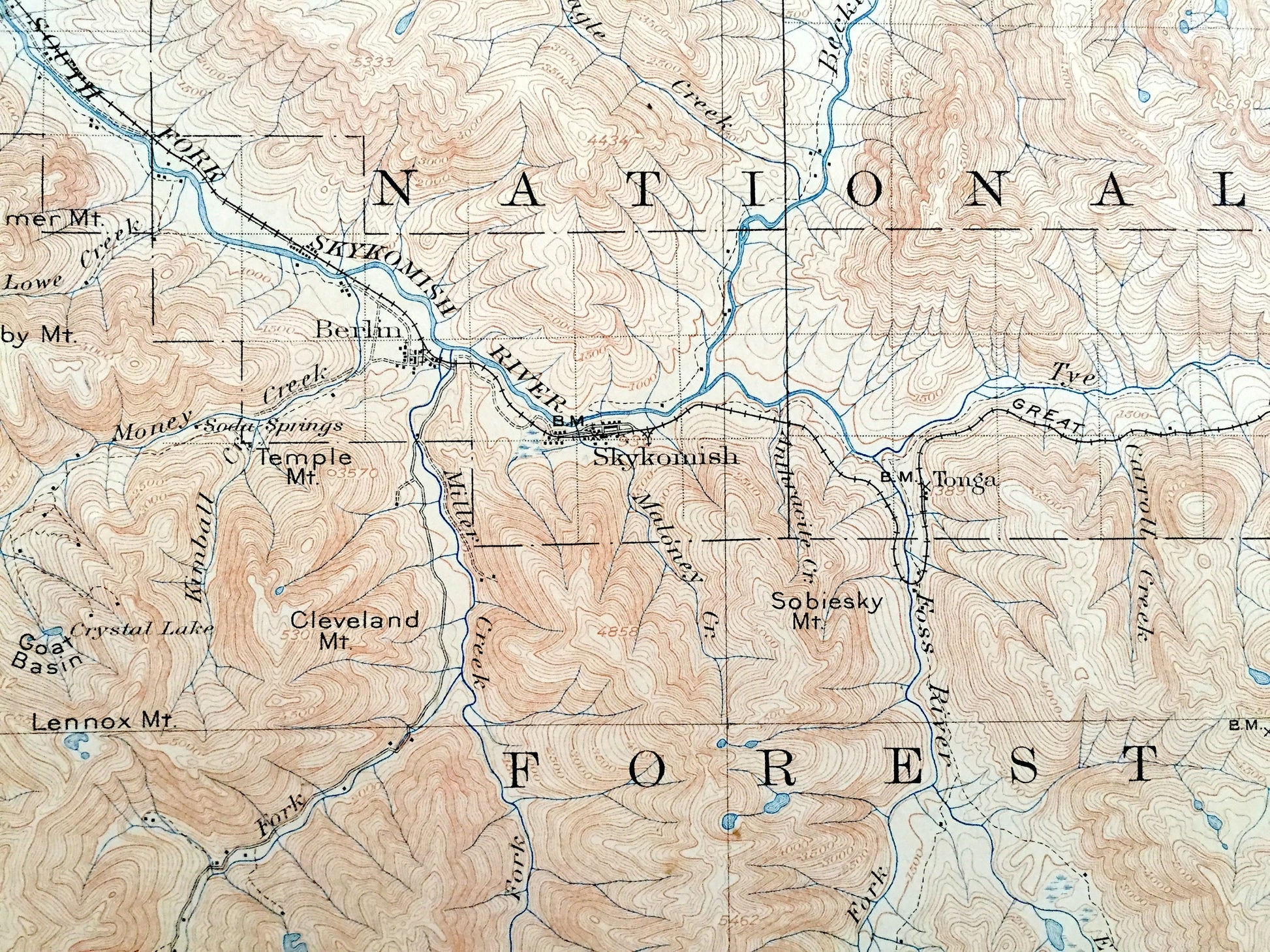 Beautiful, antique map of Skykomish, Washington and surrounding King, Kittitas, Chelan & Snohomish County area. This is an authentic 1905 edition, 1911 print from the U.S. Geological Survey and NOT a computer reproduction. Map was removed from a bound collection of maps of Washington State.