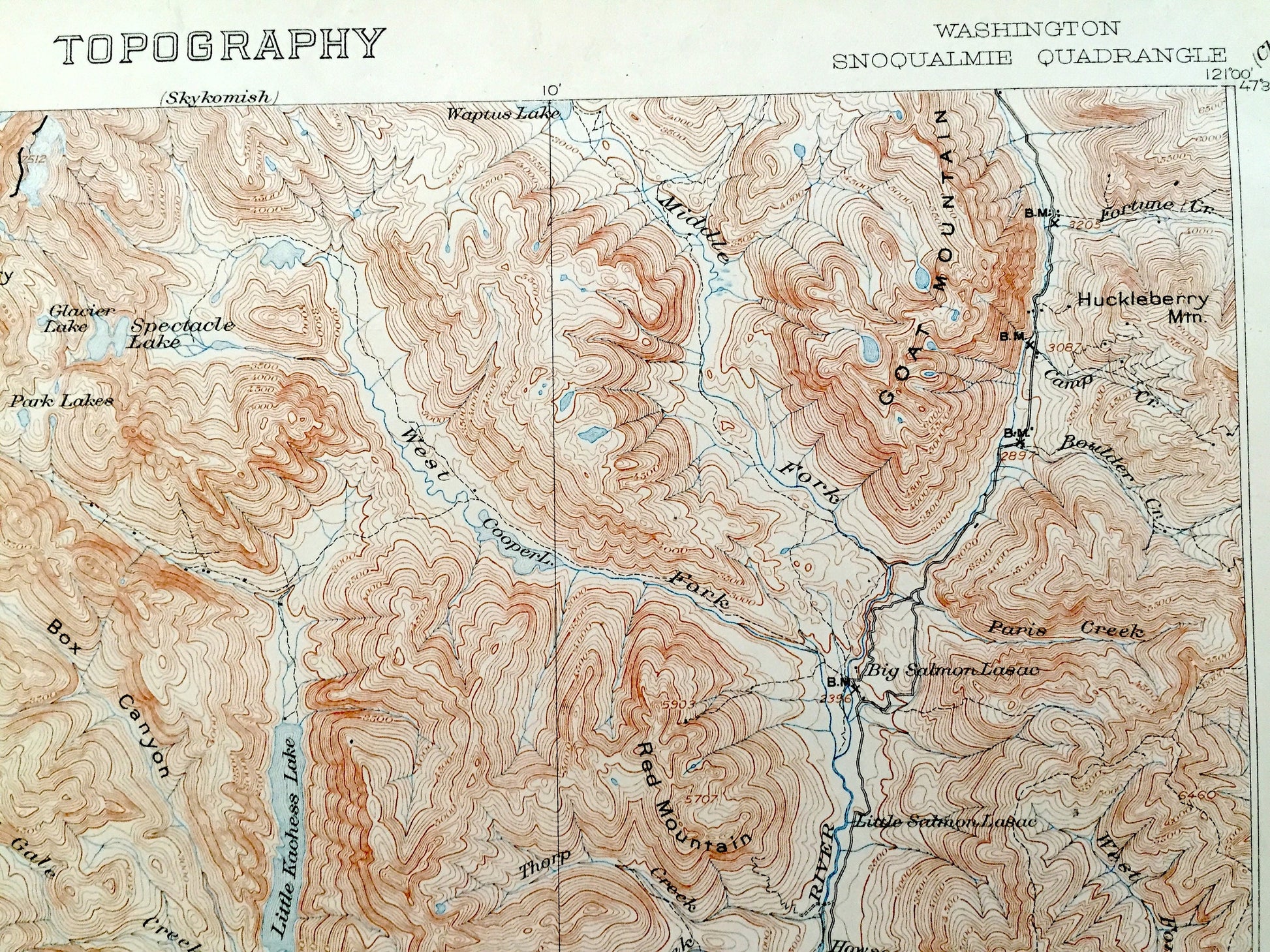 Beautiful, antique map of Snoqualmie, Washington and surrounding King, Pierce, Kittitas & Yakima County area. This is an authentic 1903 edition, 1909 print from the U.S. Geological Survey and is NOT a computer reproduction.
