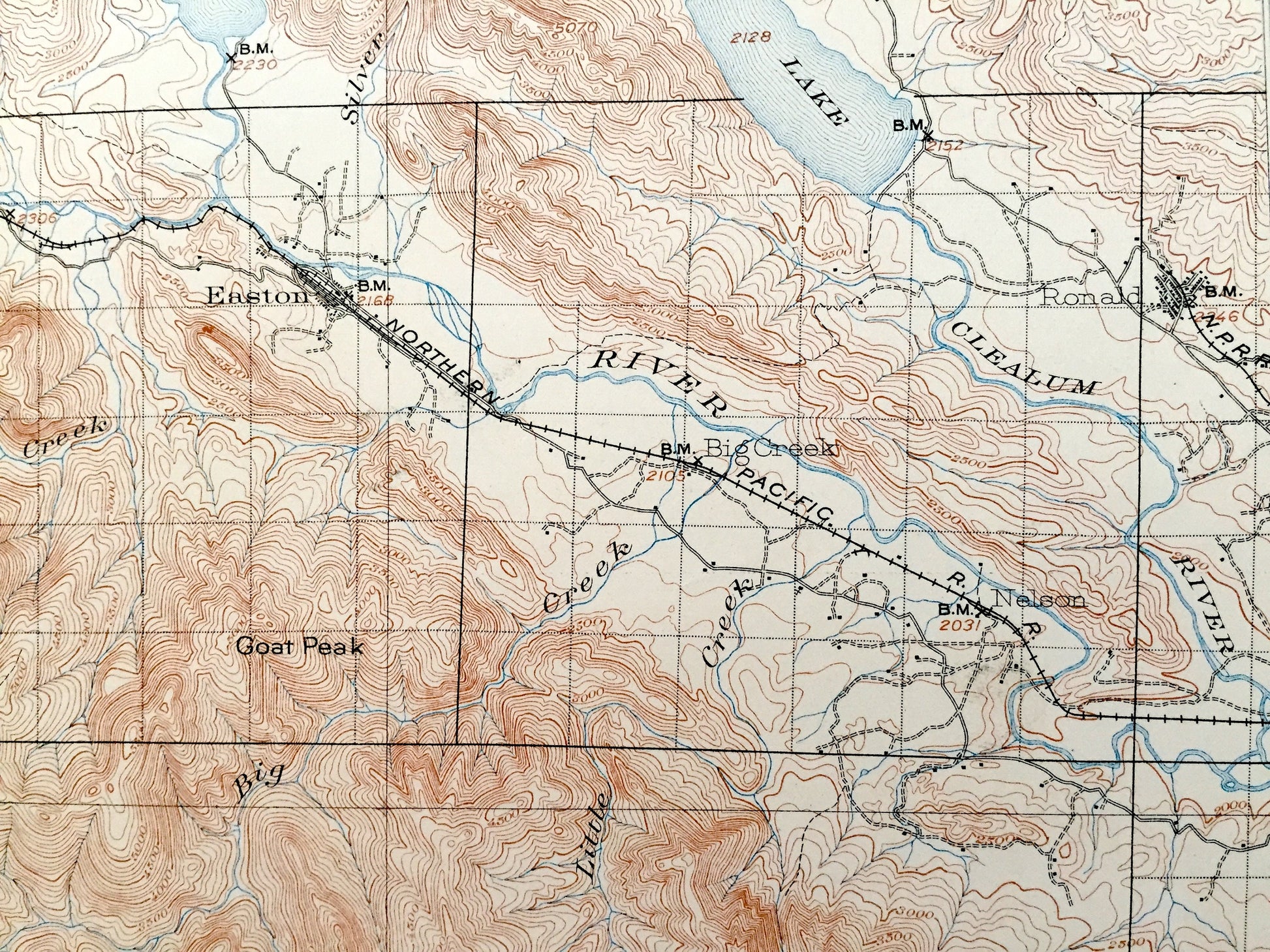 Points of Interest: Snoqualmie Mountain, Snoqualmie Pass, South Fork Snoqualmie River, Cascade Range, Mt. Rainier Forest Reserve, Goat Mountain, Yakima River, Northern Pacific Railway, Keechelus Lake, Clealum River, Kachess Lake, Box Canyon, Huckleberry Mountain, Pyramid Peak, Clealum Lake, Yakima Pass, Spectacle Lake, and lots more hills, mountains, creeks, towns, roads and train tracks.