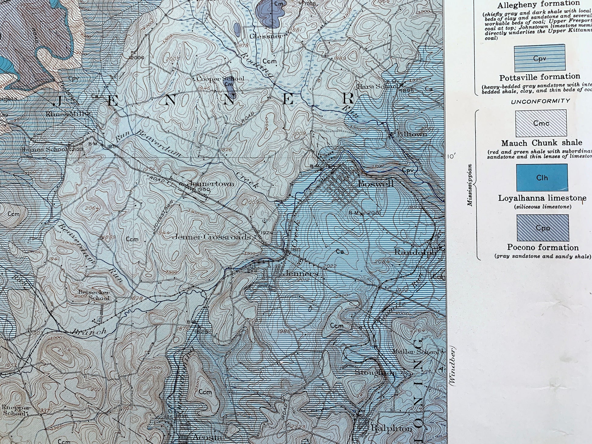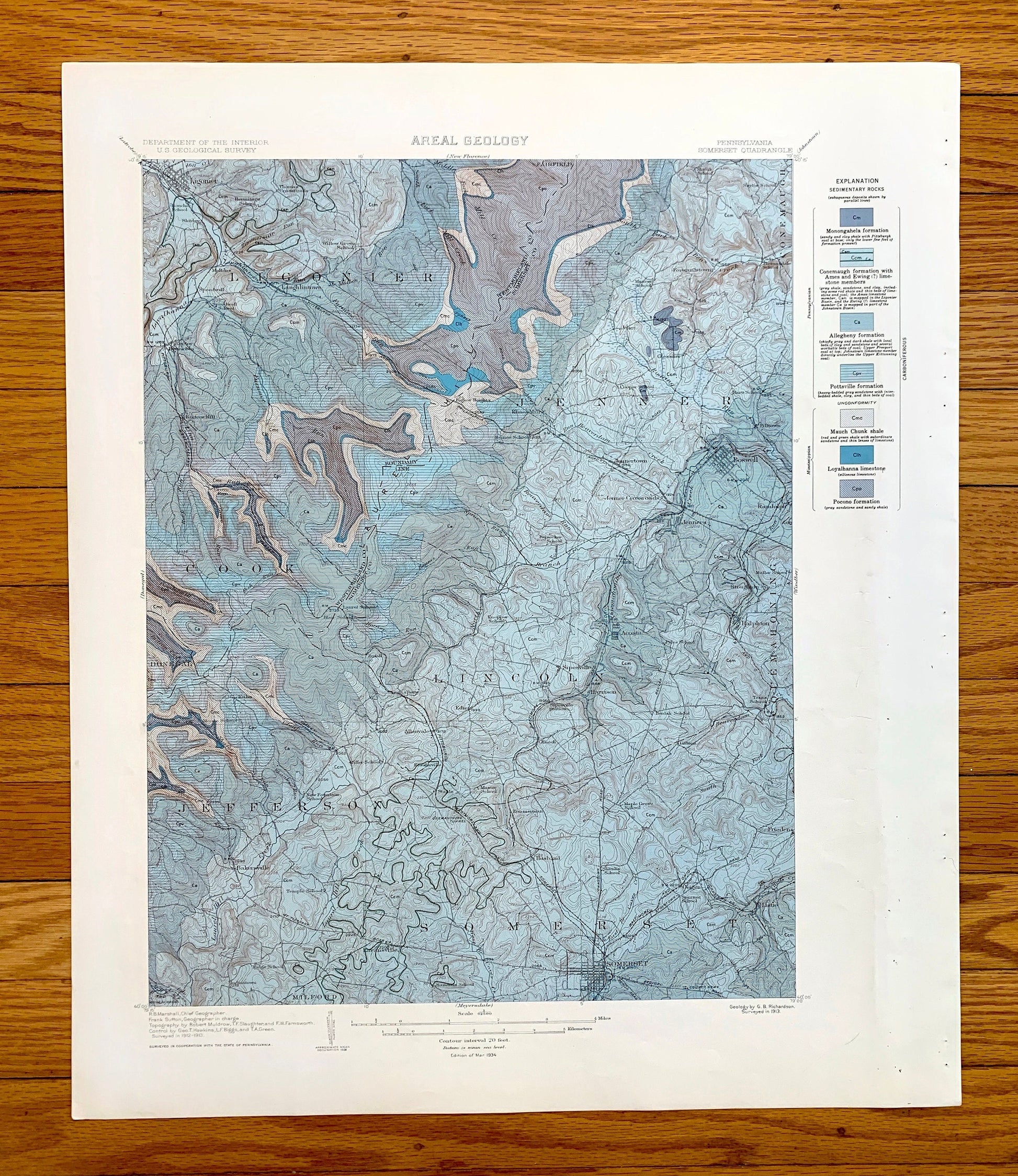 Beautiful, antique Areal Geology map of Somerset, Pennsylvania and surrounding Somerset & Westmoreland County area. This is an authentic 1913 edition, 1934 print from the U.S. Geological Survey and NOT a computer reproduction. It is from a Geologic Atlas folio.