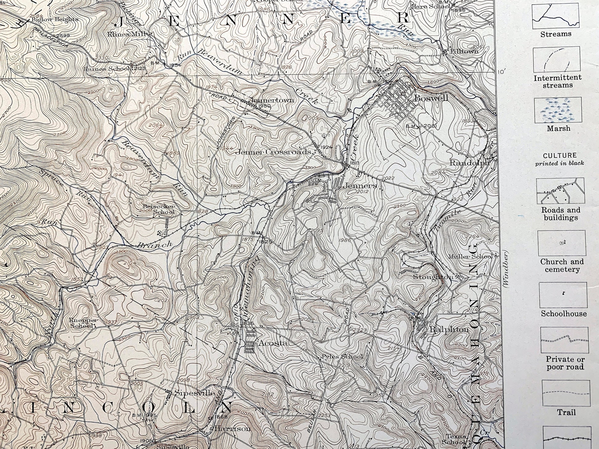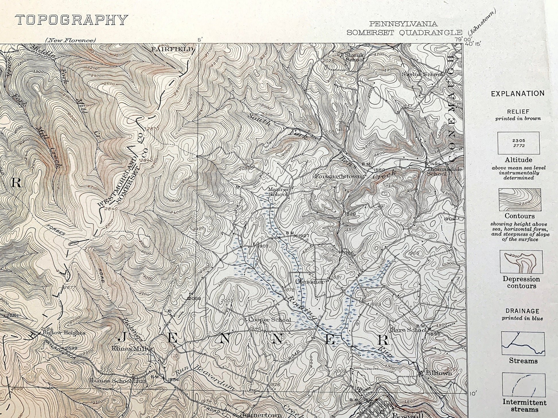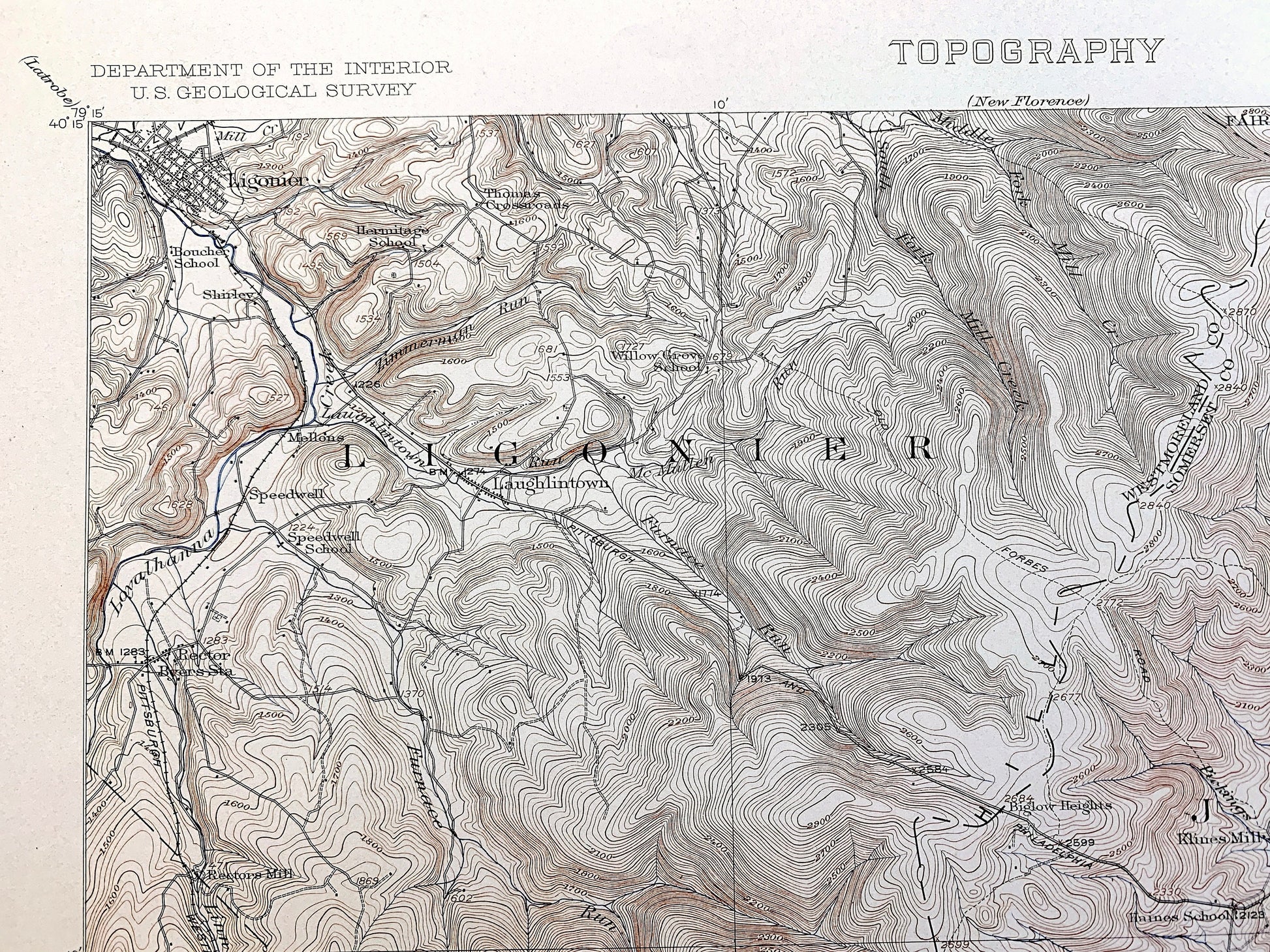 Points of Interest: Somerset County, Westmoreland County, Laurel Hill, Loyalhanna Creek, Linn Run, Laughlintown Run, Roaring Run, and lots more hills, mountains, creeks, towns, schools, churches, roads, train tracks and marshes.