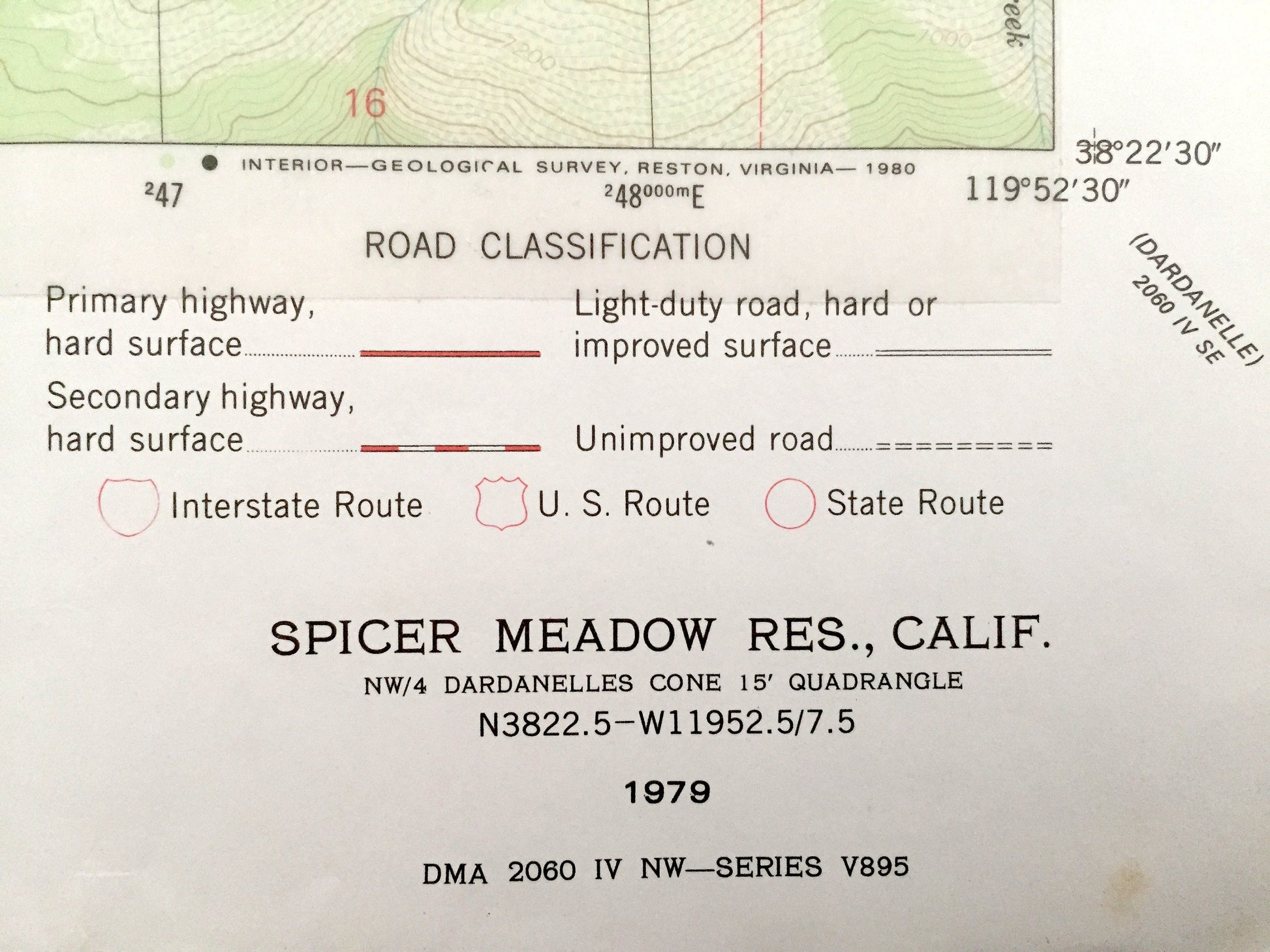 Beautiful, antique map of Spicer Meadow Reservoir, California and surrounding Tuolumne and Alpine County area. This is an authentic 1979 print from the U.S. Geological Survey and NOT a computer reproduction.
