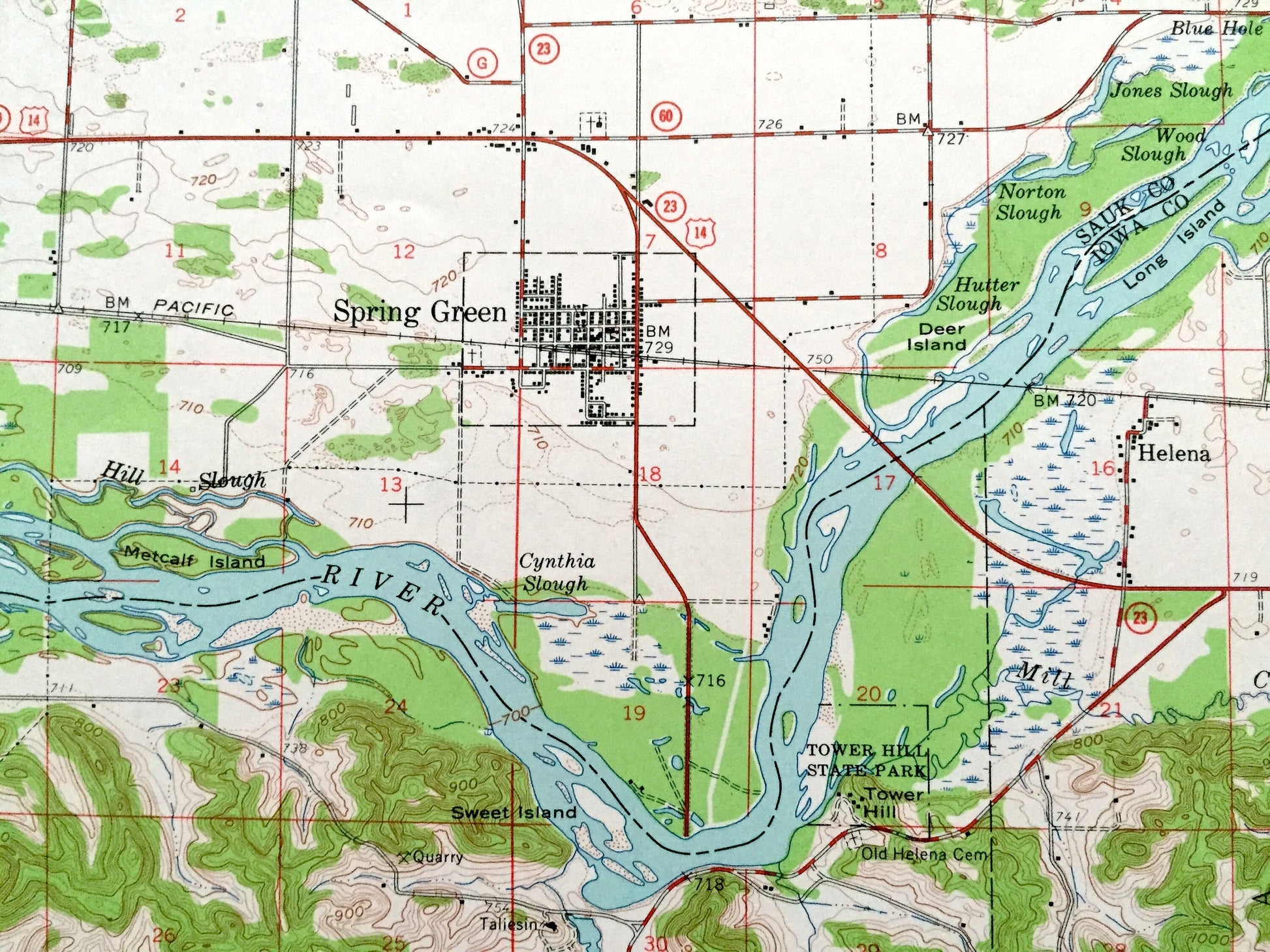 Beautiful, antique map of Spring Green, Wisconsin and surrounding Richland County, Sauk County, & Iowa County area. This is an authentic 1960 edition, 1962 print from the U.S. Geological Survey and NOT a computer reproduction.