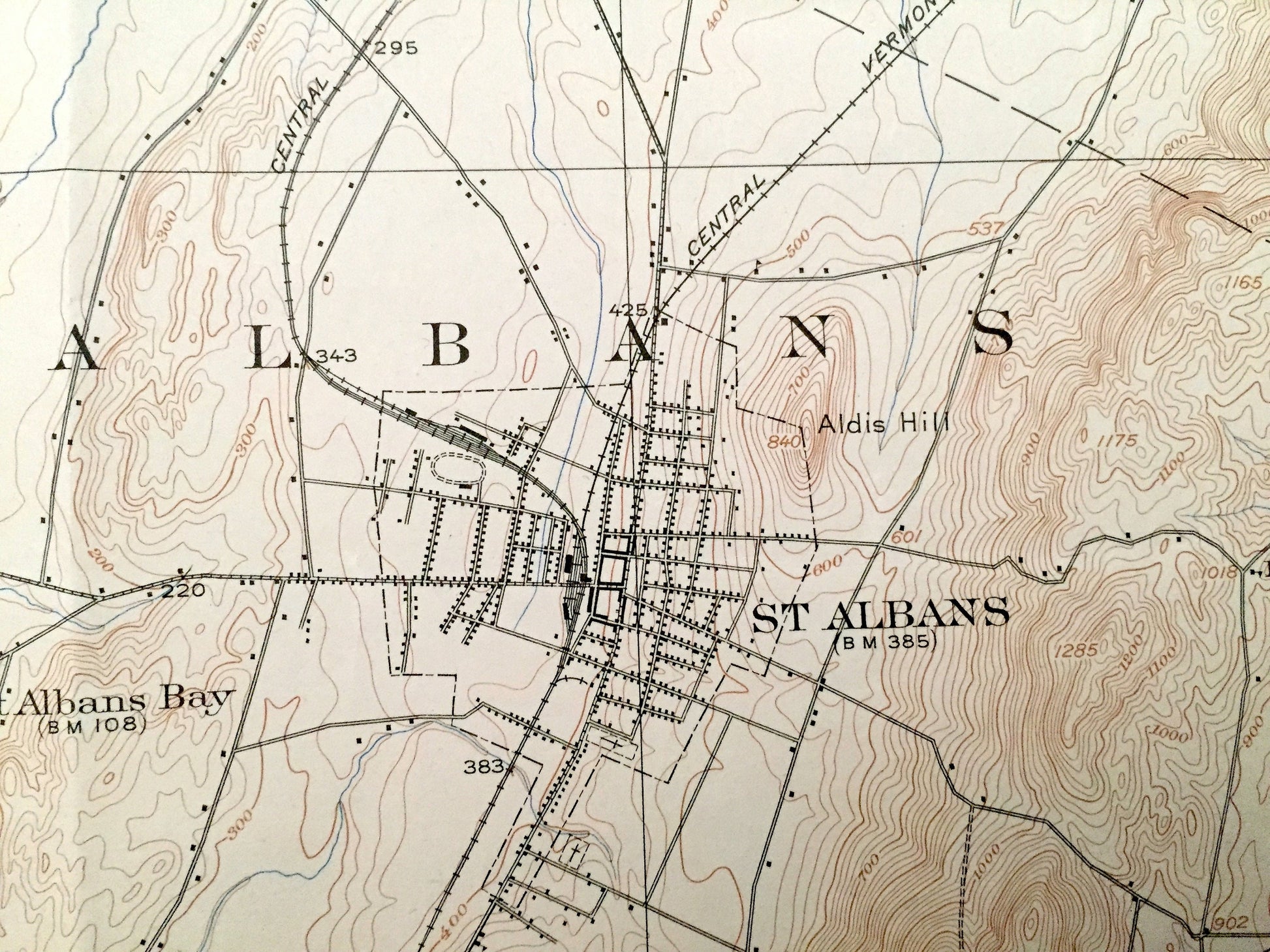 Points of Interest: Lake Champlain, North Hero Island, Butler Island, Missisquoi Bay, St. Albans Bay, Charcoal Creek, Missisquoi River, Rock River, Hog Island, Metcalfe Island, Shad Island, Maquam Bay, Lapans Bay, St. Albans Point, Burton Island, St. Albans Hill, Aldis Hill, Central Vermont Railroad, and more roads, houses, ponds, hills, streams, islands and coves.