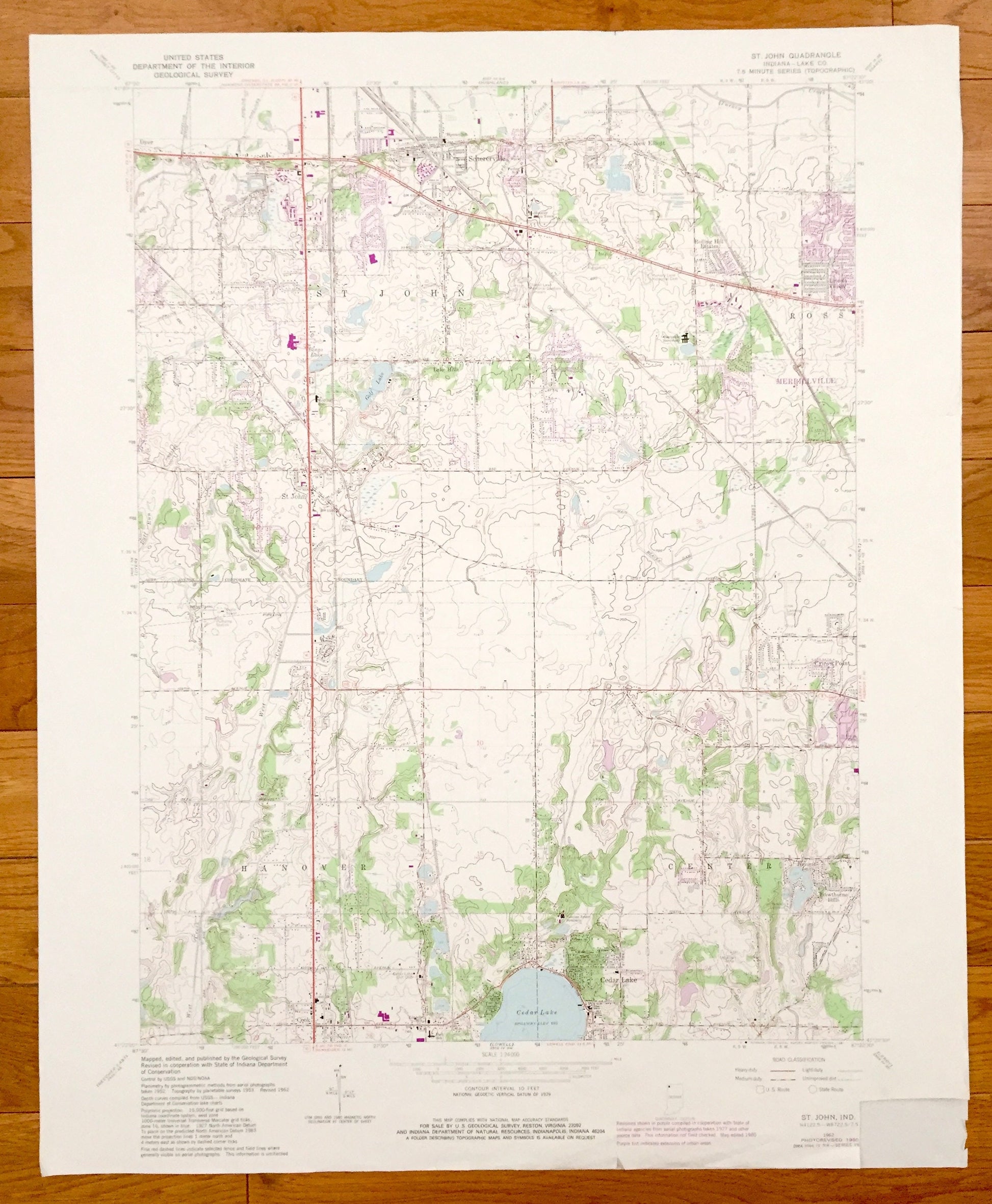 Beautiful, antique map of St. John, Ross, Hanover & Center, Indiana and surrounding Lake County area. This is an authentic 1962 edition, 1980 print from the U.S. Geological Survey and NOT a computer reproduction.
