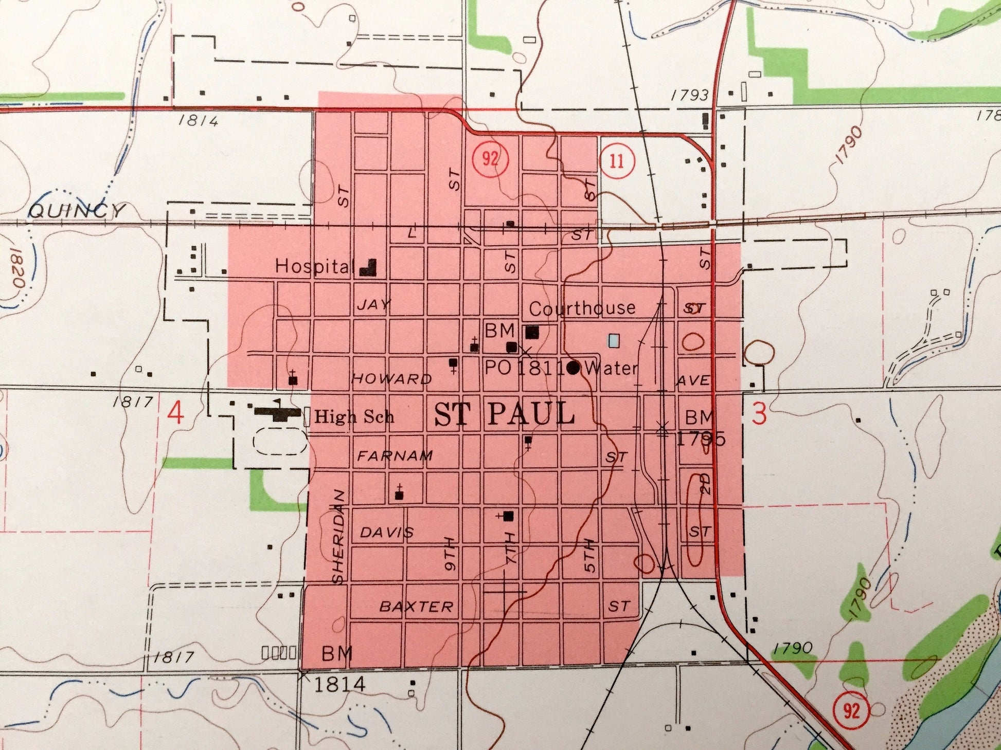 Points of Interest: School No. 15, School No. 12, Union Pacific Railroad, Middle Loup River, Chicago Burlington and Quincy Railroad, St Paul High School, Courthouse, Radio Tower and many more roads ponds and houses.